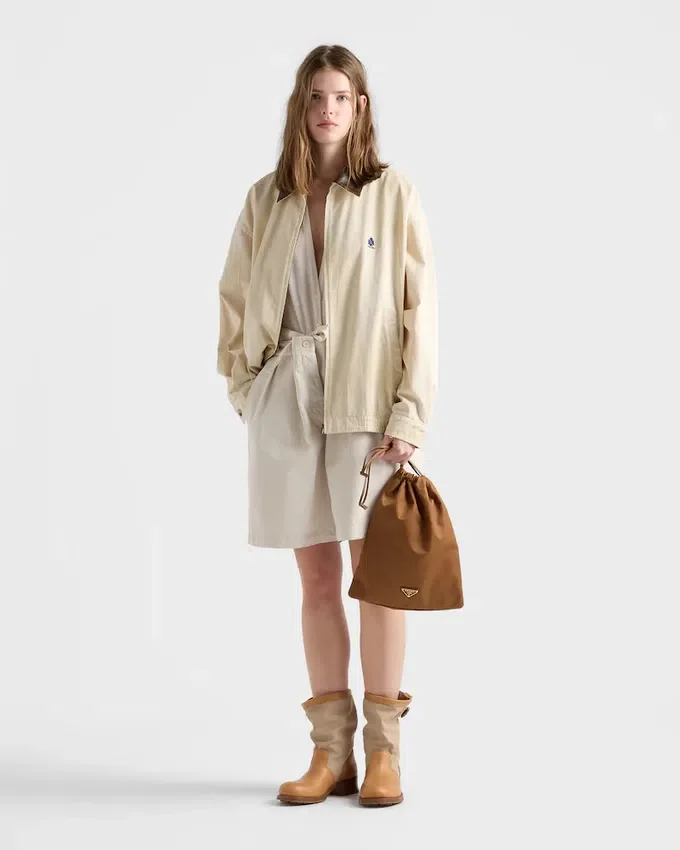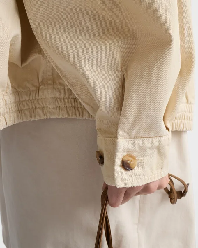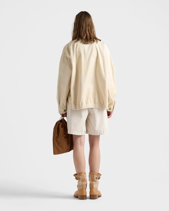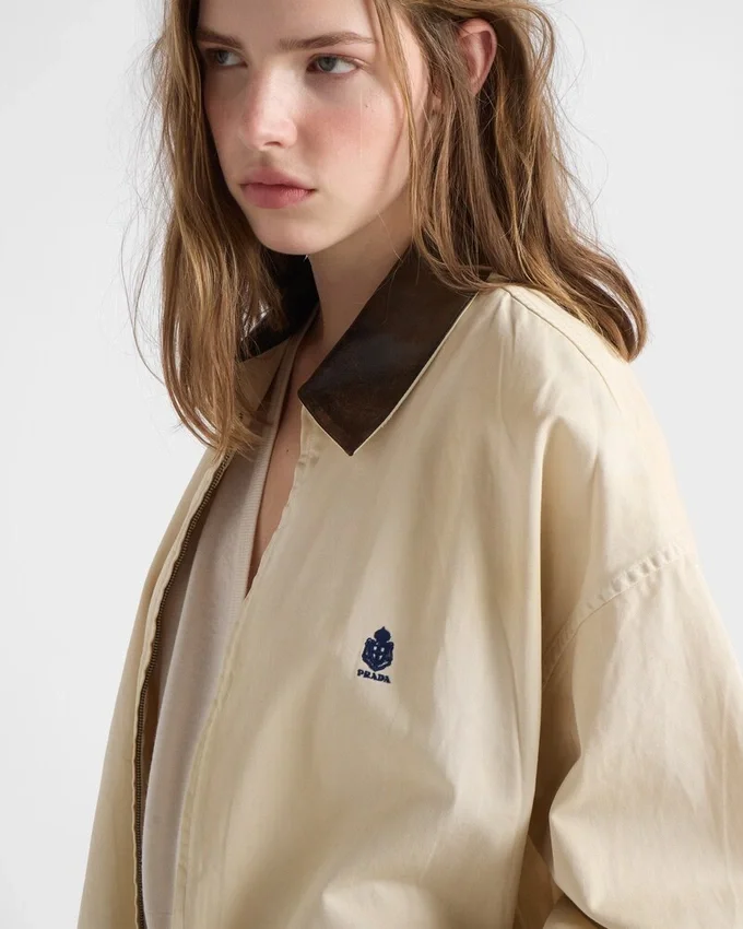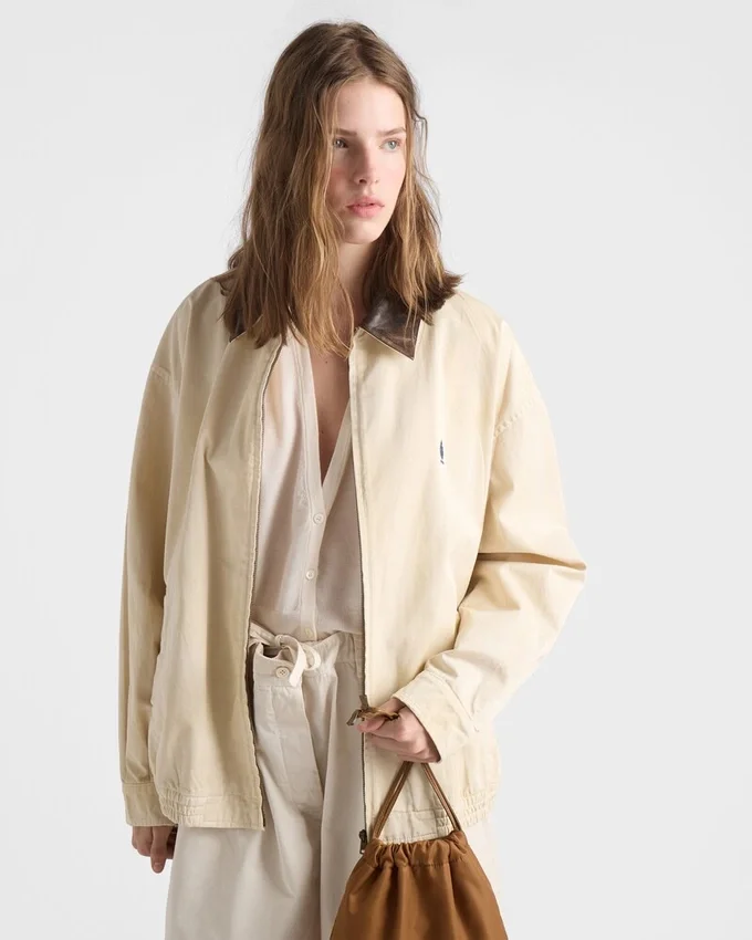 機能性と洗練さを完璧に融合させたこのギャバジン・ブルゾンジャケットは、Pradaのワードローブにおけるキーピースです。 このデザインは、生地に立体感を生み出す職人技による加工でヴィンテージ風の仕上げを施し、ワークウェアの定番を再解釈したものです。ゆったりとしたラインのシルエットはレザーカラーで仕上げられ、フロントのジッパー開閉とコントラストを効かせたロゴが特徴です。