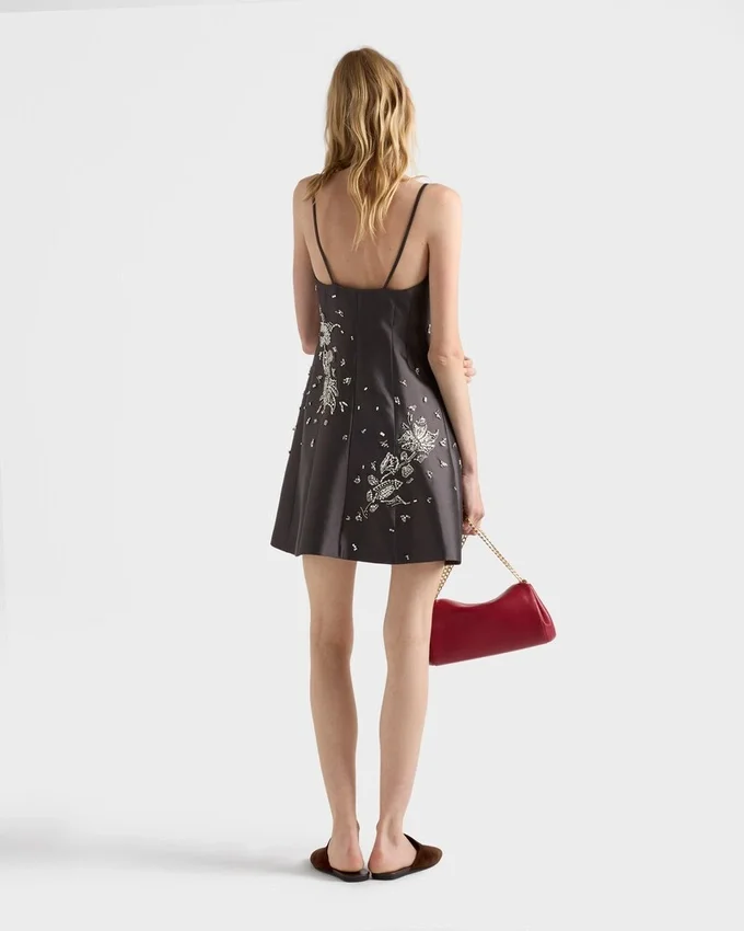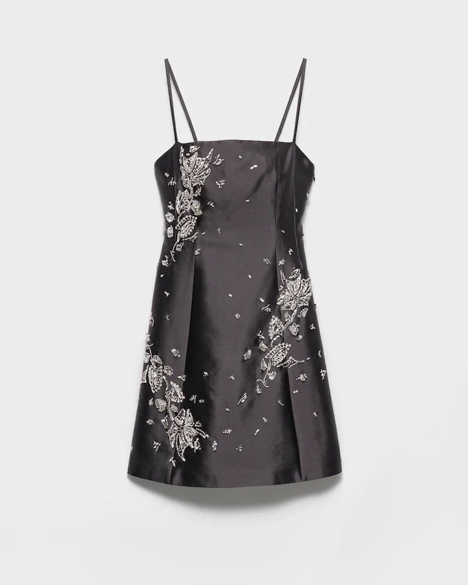 きらめく装飾が、ウールとシルクで作られたシンプルなドレスを彩り、洗練されたフィット&フレアのシルエットとスパゲッティストラップが特徴です。
