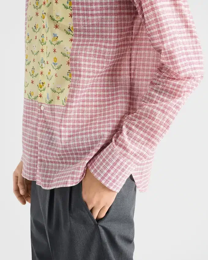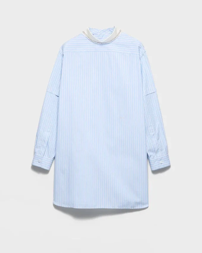 厳格さと装飾、テーラードラインと華やかなディテールの予想外の融合が、このストライプのポプリントップを特徴づけています。このアイテムは、メンズウェアの定番を再解釈し、その形と機能を完全に変貌させたものです。