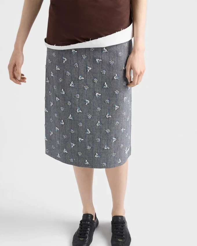 洗練された調和とコントラストが特徴のこのウールスカートは、ピンストライプのモチーフによって幾何学的なシルエットが強調されています。きらめく刺繍が、スタイルのシャープな印象を和らげ、繊細でロマンチックなニュアンスを添えています。