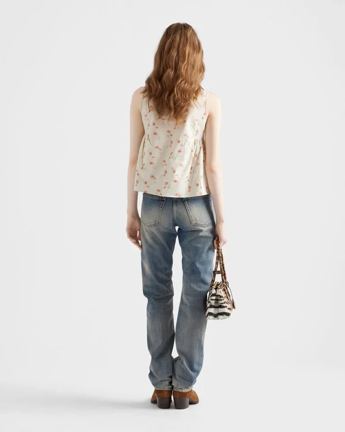 このリネントップのシルエットとディテールは、ヴィンテージの魅力を備えたロマンチックな一着を際立たせています。繊細なフローラルプリントとレースのトリムがデザインに彩りを添えています。