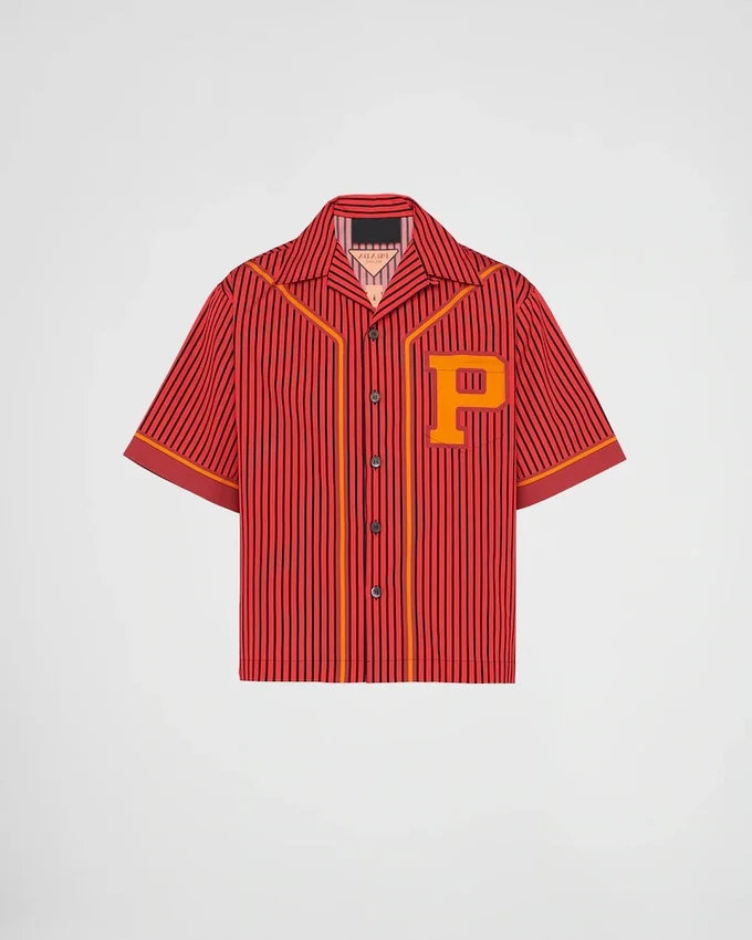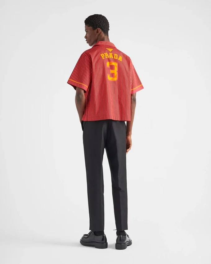 ボウリングカラーを、デザインのスポーティーな雰囲気を強調するレトロなプリントで再解釈しました。オーバーサイズのシルエットとレトロなディテールを備えたこのコットン素材のアイテムには、特徴的な幾何学形状のトライアングルロゴがあしらわれています。