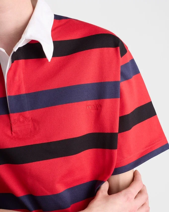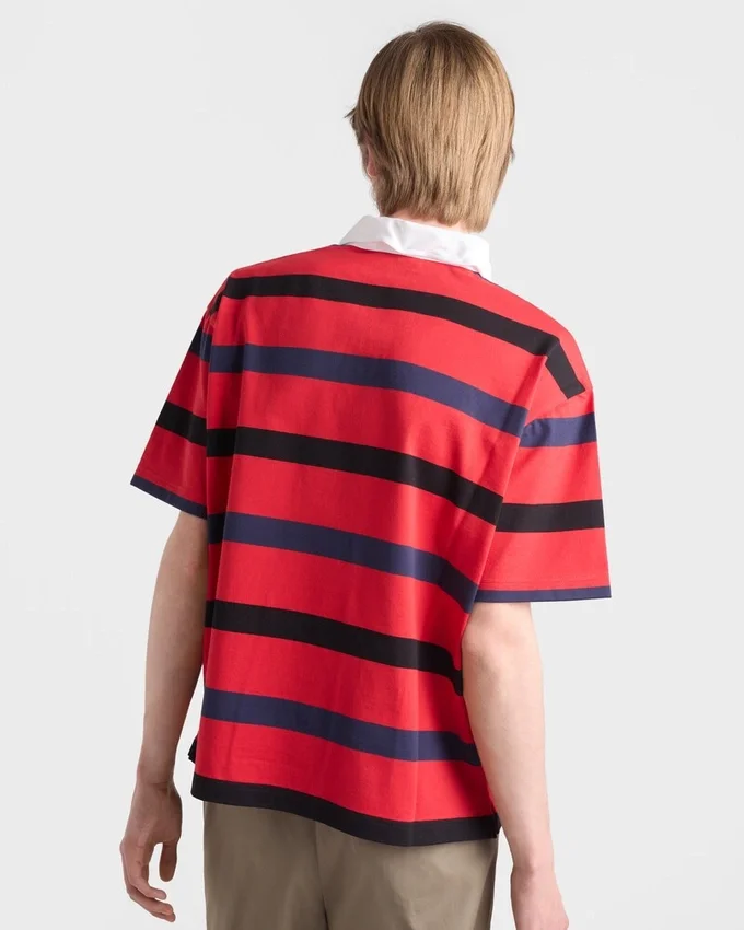 この半袖コットンポロシャツは、レトロなムードをまとったカジュアルスタイルを体現しています。ストライプ柄が、ポプリンカラーが意外なアクセントを加えるオーバーサイズシルエットに活気を与えています。