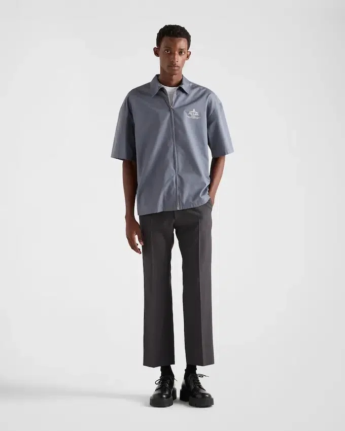 このテクニカルコットンシャツは、ワークウェアのディテールを洗練された美学で再解釈したボックスシルエットが特徴です。 ジッパー開閉が特徴の半袖スタイルは、コントラストカラーのプリントされたアーカイブロゴで仕上げられています。