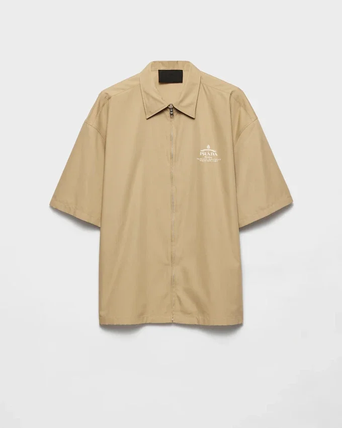 このテクニカルコットンシャツは、ワークウェアのディテールを洗練された美学で再解釈したボックスシルエットが特徴です。 ジッパー開閉が特徴の半袖スタイルは、コントラストカラーのプリントされたアーカイブロゴで仕上げられています。