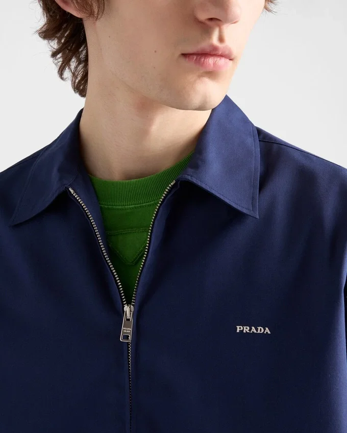 Pradaのコレクションを特徴づける二面性は、異なる素材やスタイルを融合させて革新的なものを生み出すハイブリッドデザインの創造に反映されています。 メンズウェアの定番アイテムであるクラシックカラーのオーバーサイズシャツに、現代的なアクセントを加えるジッパー開閉を採用し、新たな解釈を加えました。
