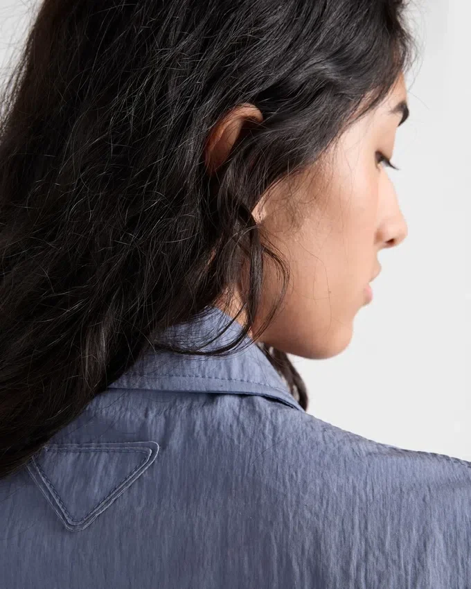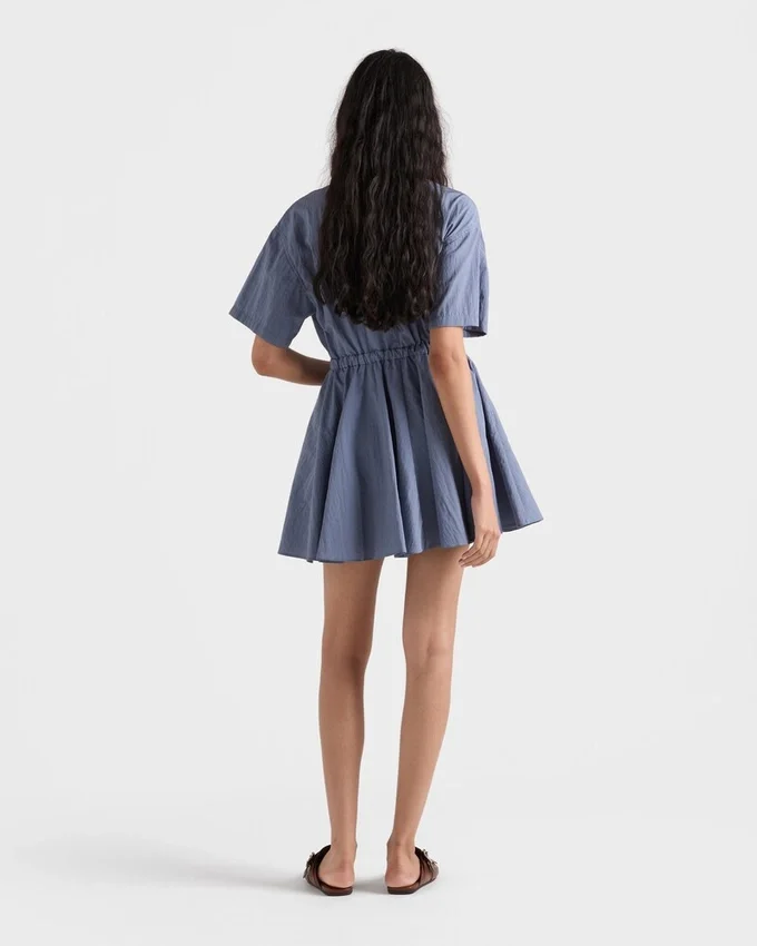 Pradaの二面性、すなわち厳格さとモダニズムが具現化されたこのテクニカルなポンジードレスは、機能的なディテールが際立っています。