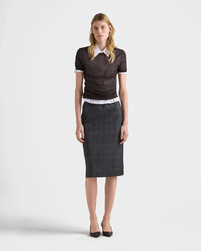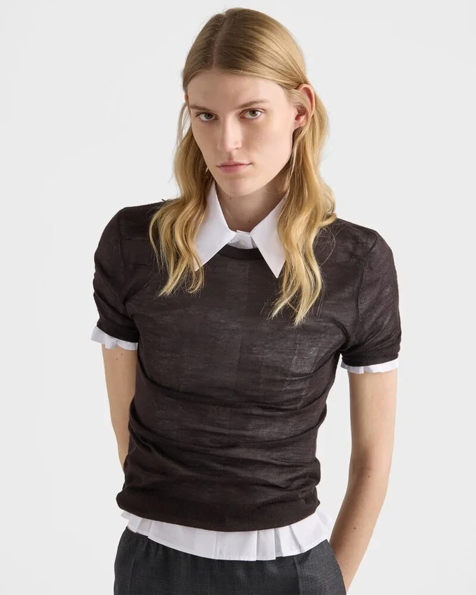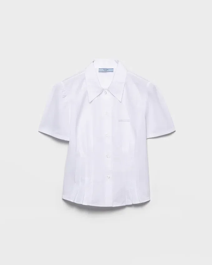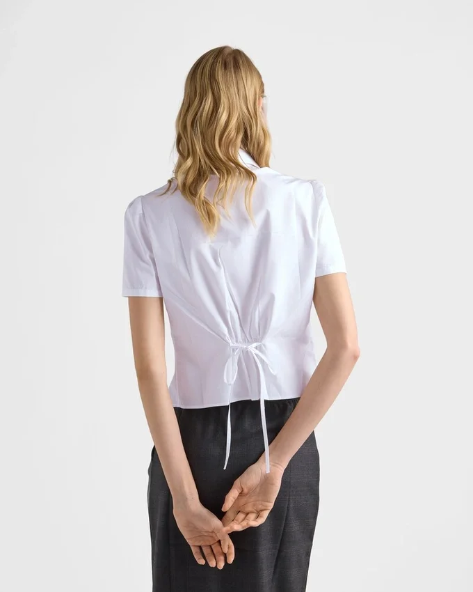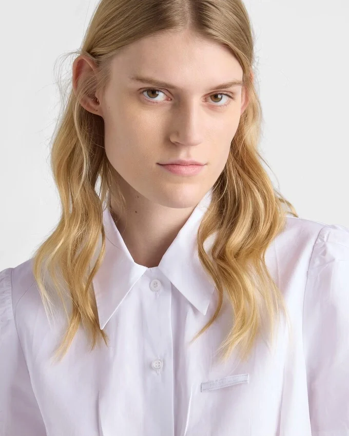 レトロな魅力とフェミニンなディテールが特徴のこのシャツは、フレア状の裾を持つスリムなシルエットが特徴です。エレガントで繊細なデザインは、光沢のある仕上げが施されたコットンポプリンで作られており、流れるような洗練された印象を与えます。