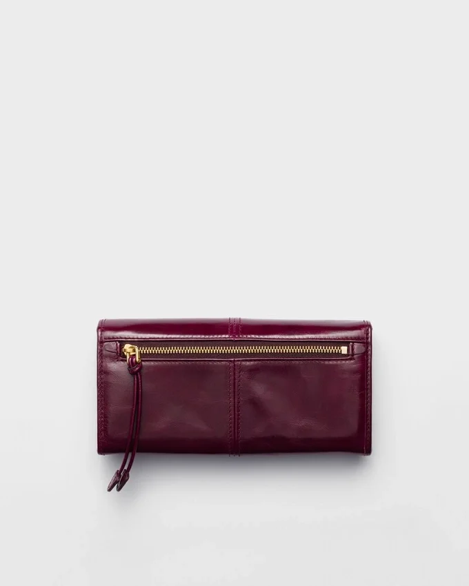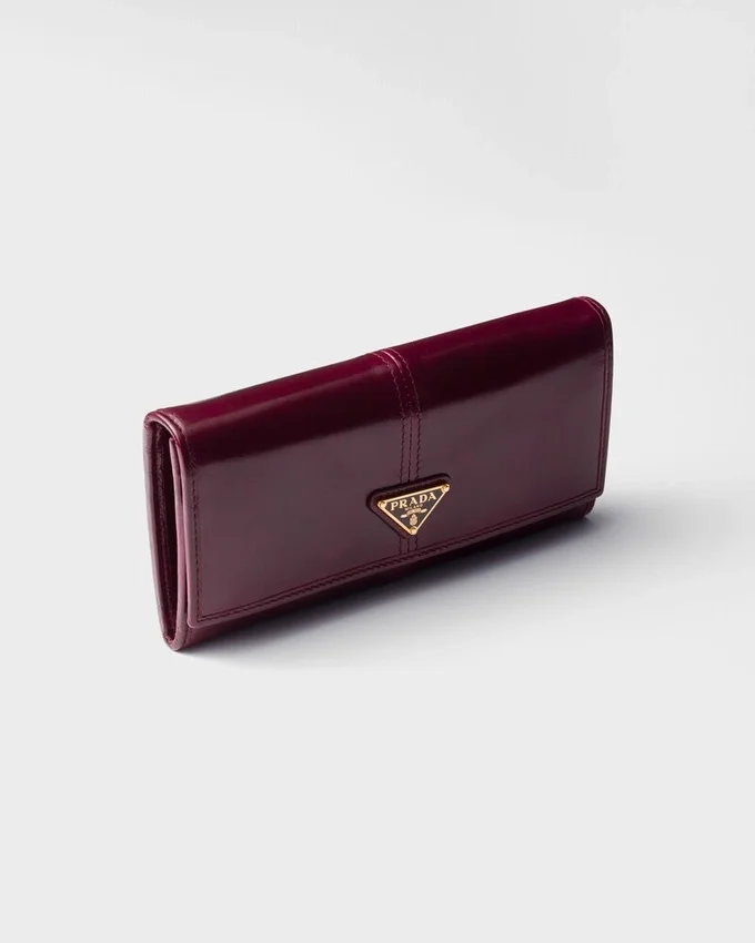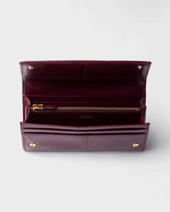 この大型レザーウォレットは、洗練されたデザインが特徴で、エナメル加工された金属製の三角ロゴが上品な雰囲気を添えています。スナップボタンで開閉し、内部には複数の収納スペースが備わっています。