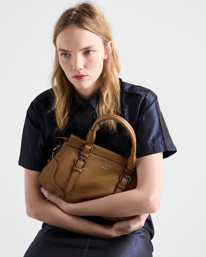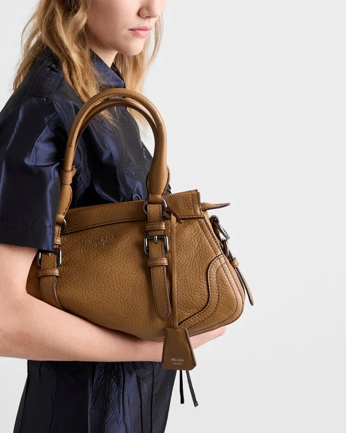 過去と現在が調和したこのバッグは、トラベルをテーマにしたデザインで、PradaのDNAのルーツへの回帰を象徴しています。豊かな質感と不規則な木目を持つレザーで作られたコンパクトで多用途なシルエットは、取り外し可能なショルダーストラップによって完成され、様々なスタイルで着用できます。 トラベルバッグから着想を得た補強されたコーナーは、伝統的な職人技やアーカイブとの絶え間ない対話を表現しています。