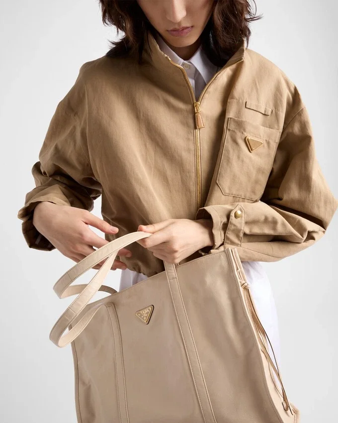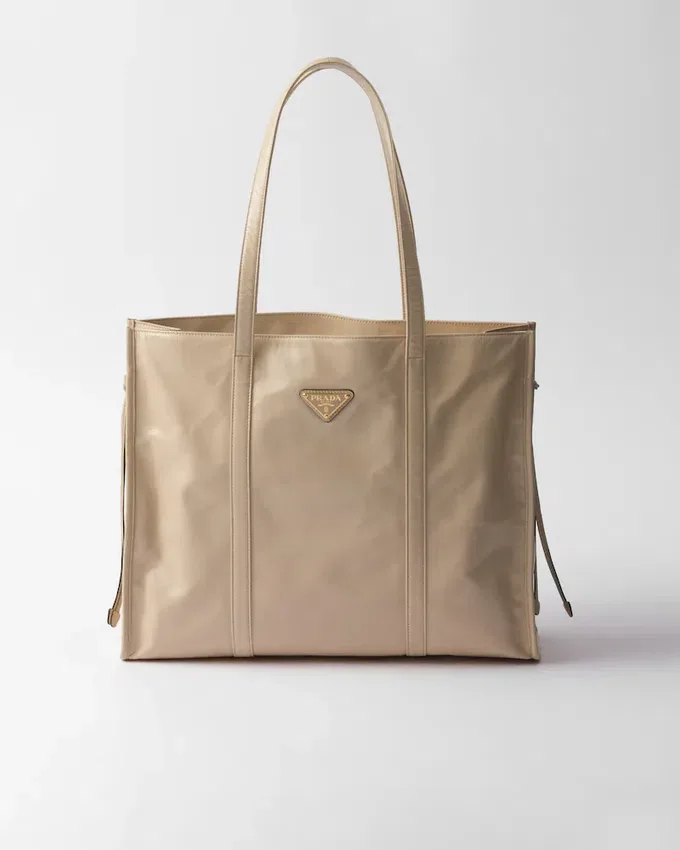 このモダンで実用的なトートバッグは、洗練されたゆったりとしたシルエットが特徴で、光沢のある仕上げのレザーで作られています。