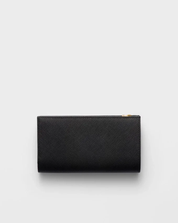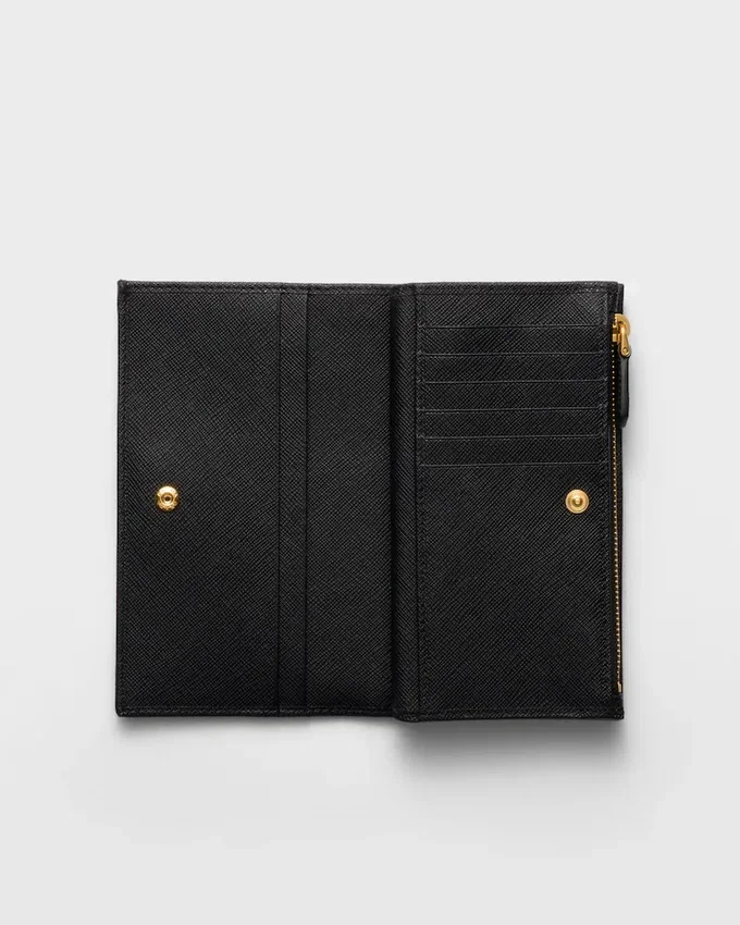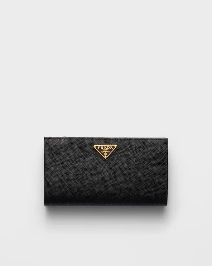 洗練されたラインが際立つ、アイコニックなSaffianoレザー製のウォレット。スナップ留めとメタル製の三角ロゴをあしらったこのアクセサリーは、内部にポケットとスロットを備えています。