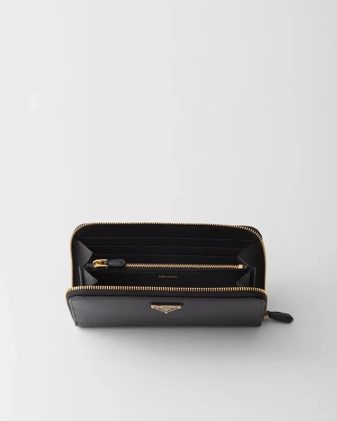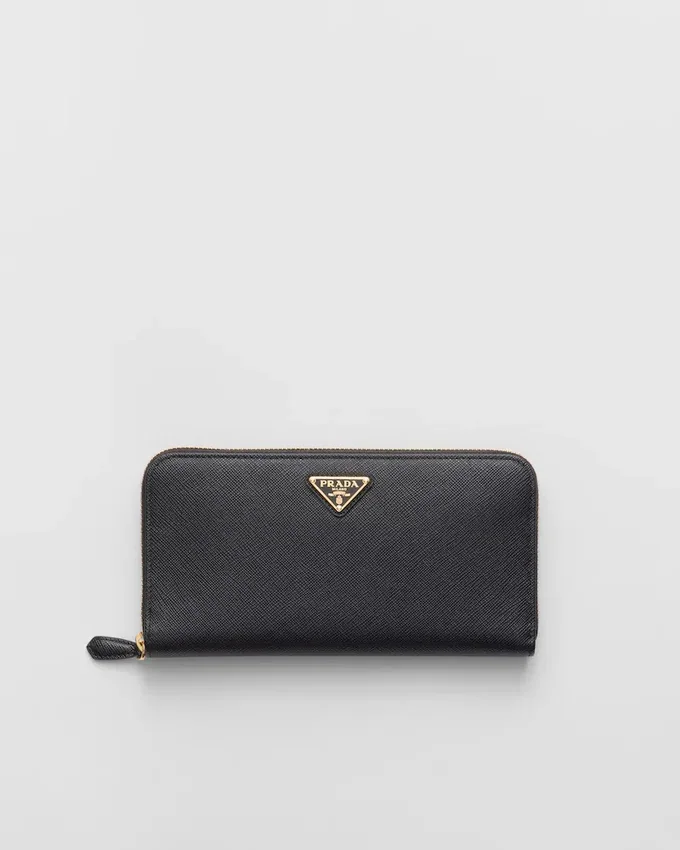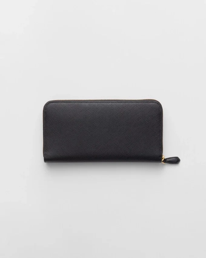 曲線的なエッジが特徴のSaffianoレザー製ウォレット。ジッパー付き紙幣入れ1つ、クレジットカード用スロット12個、書類用ポケット6つ、ジッパー付き小銭入れ1つを備えています。Pradaのロゴとジッパー開閉仕様で仕上げられています。