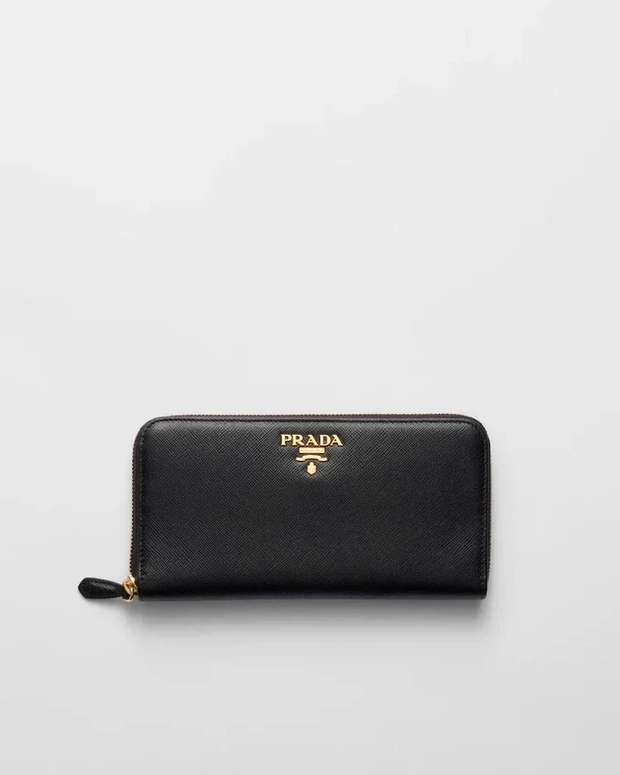 このSaffianoレザーの財布には、Pradaのロゴが施されています。全周ジッパーを開けると、豊富なカードスロット、ポケット、そして小銭用のジッパー付きコンパートメントが現れます。