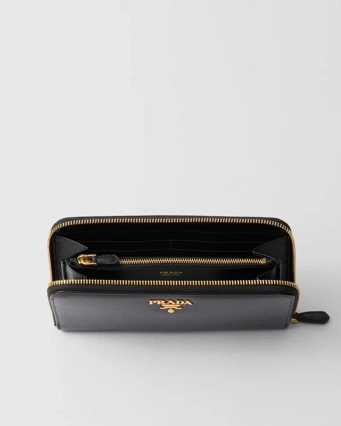 このSaffianoレザーのウォレットには、Pradaのロゴが施されています。全周ジッパーを開けると、多数のカードスロット、ポケット、そしてコイン用のジッパー付きコンパートメントが現れます。