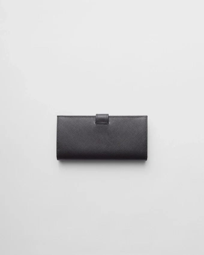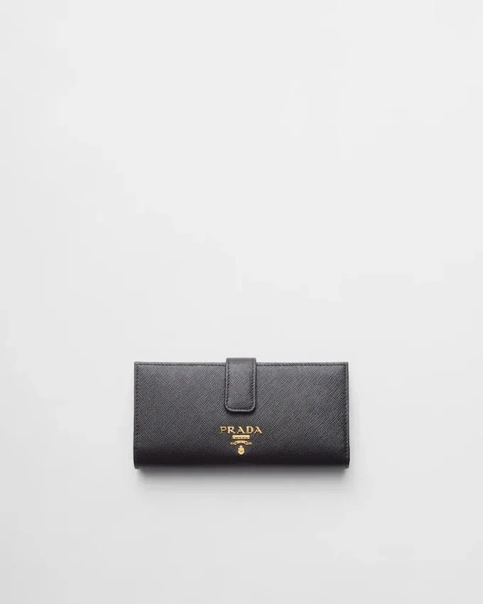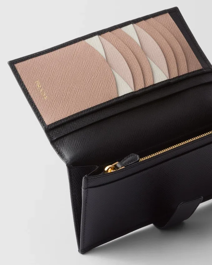 このウォレットは、Pradaの象徴的な素材であるSaffianoを使用しています。最高品質のカーフレザーに、クロスハッチのテクスチャーとワックス加工が施されています。ロゴのレタリングがアクセサリーを彩ります。