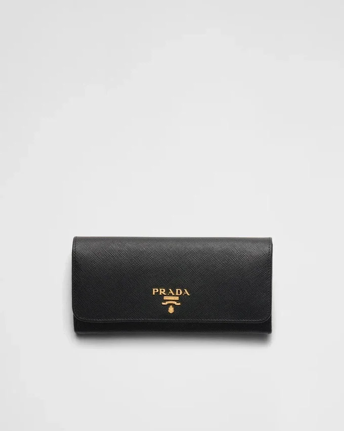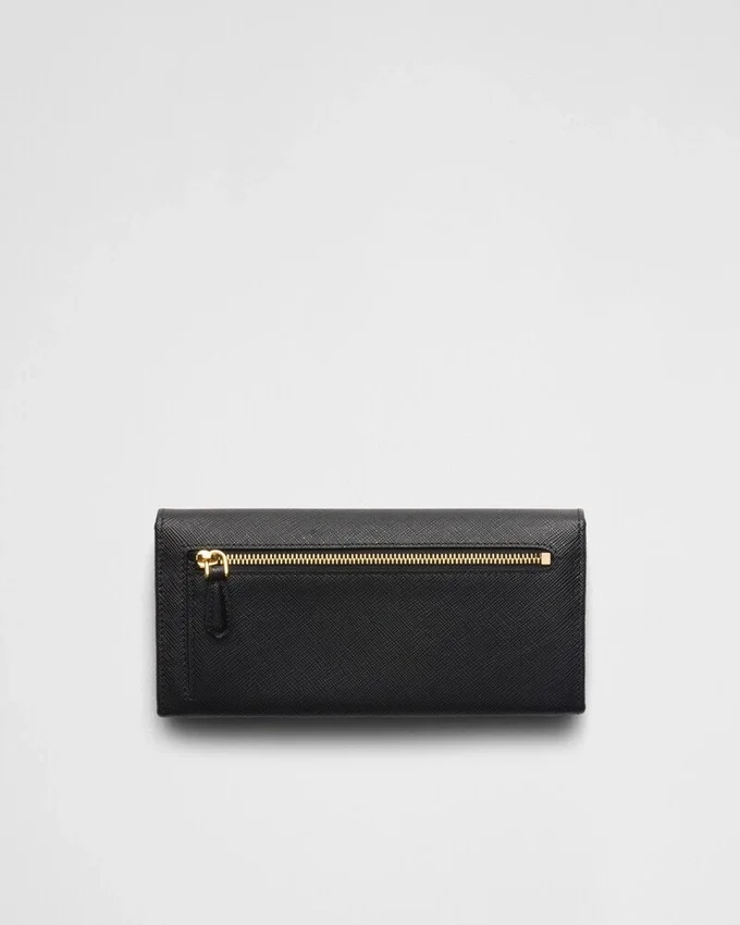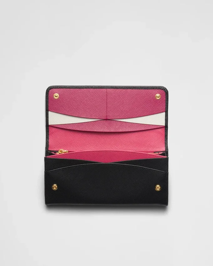ゴールド仕上げのPradaロゴが入ったSaffianoレザー製フラップウォレット。モノトーンの外観とは対照的に、内側にはマルチカラーのレザーライニングが施され、様々なコンパートメントやポケットが備わっています。