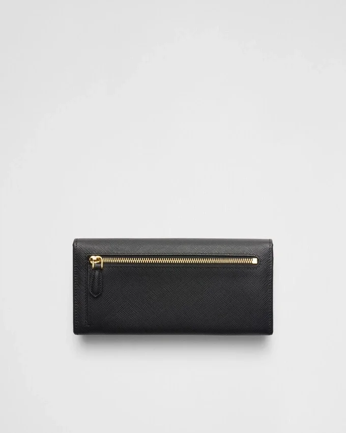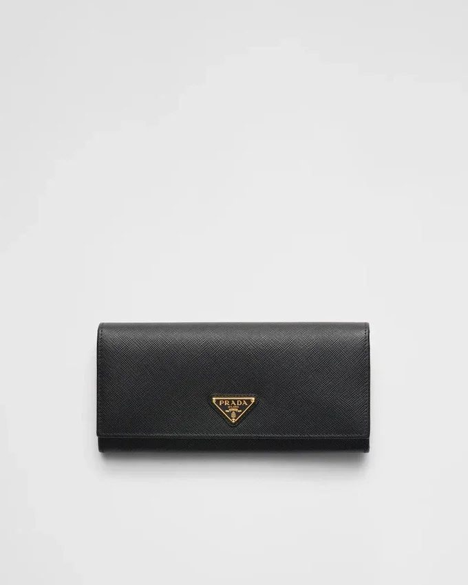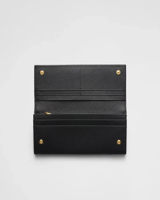 Prada Triangleロゴをあしらったこのフラップウォレットは、Saffianoレザーで作られています。スナップ留めを開けると、さまざまなカードスロットやポケットが現れます。