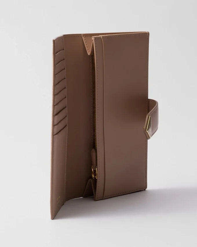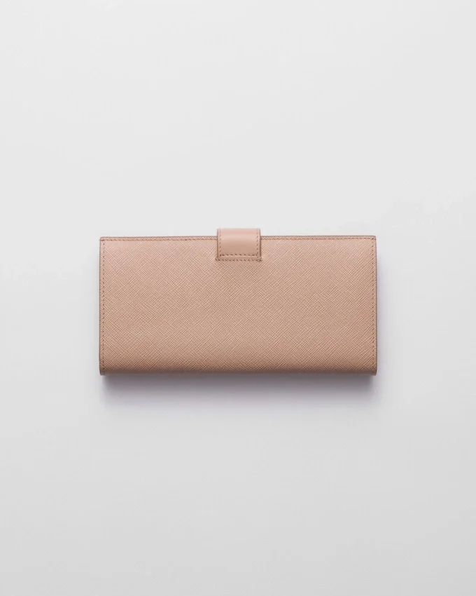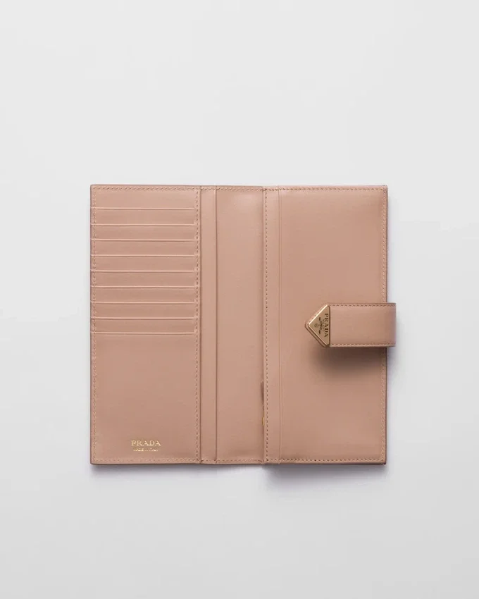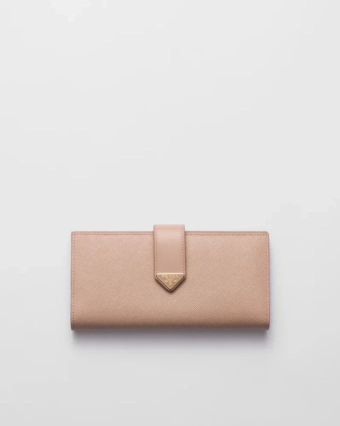 洗練された気品と高級感あふれるこの大型ウォレットは、滑らかなレザーと、Pradaの象徴的な素材であるクロスハッチテクスチャーのSaffianoレザーを組み合わせて仕立てられています。ミニマルなデザインが特徴で、複数のコンパートメントとポケットを備え、ブランドの象徴であるエナメル加工の三角ロゴがあしらわれています。