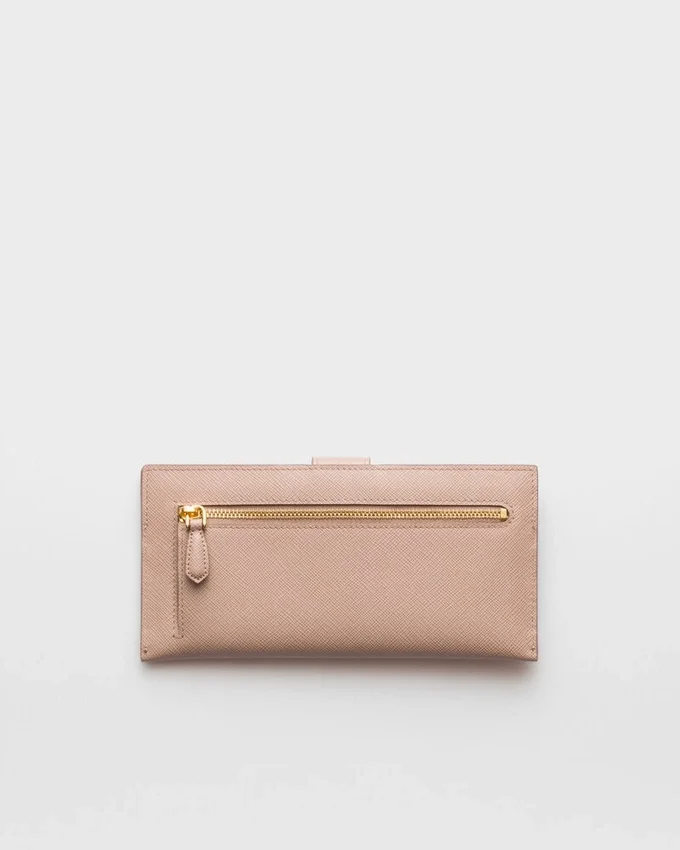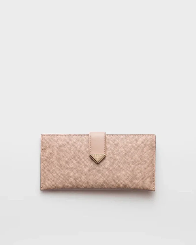 この大きめでエレガントかつ洗練されたウォレットは、特徴的なクロスハッチ仕上げと滑らかなレザーのディテールが施されたSaffianoレザーで作られています。ミニマルなデザインのこのアクセサリーは、複数のコンパートメントとポケットを備え、留め具を飾る象徴的なエナメル加工のメタルトライアングルロゴによって完成されています。