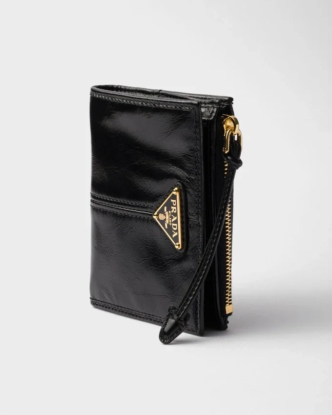 レザーの優雅さと、エナメル加工されたメタル製トライアングルロゴの象徴的なタッチが、この洗練された小型ウォレットを彩ります。内部のコンパートメントと機能的なディテールの組み合わせが、デザインを完成させています。