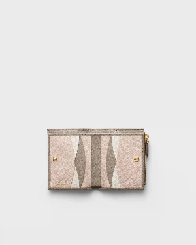 Saffianoレザー製のこの小型財布には、複数の内ポケットとカードスロットが備わっています。スナップ留め付きのこのアクセサリーは、メタルレタリングのロゴで装飾され、マルチカラーのプリント裏地がアクセントになっています。