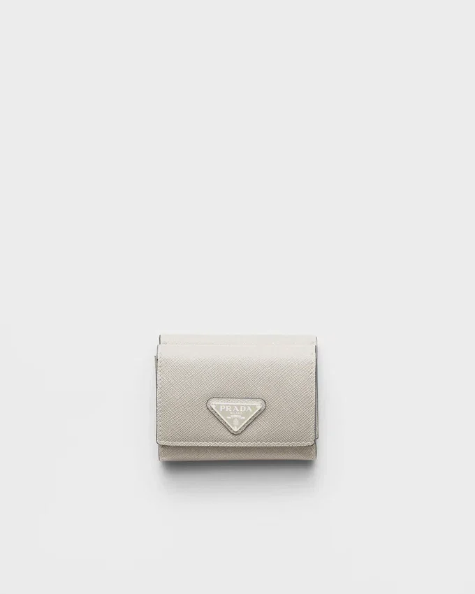 洗練されたラインとSaffianoレザーの象徴的な質感が特徴のこのウォレットは、前面に三角形のロゴがあしらわれています。内部にはポケットや仕切りが備わっています。