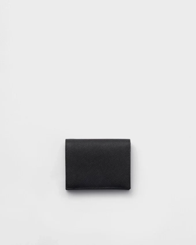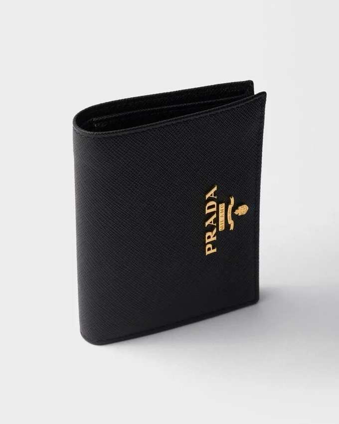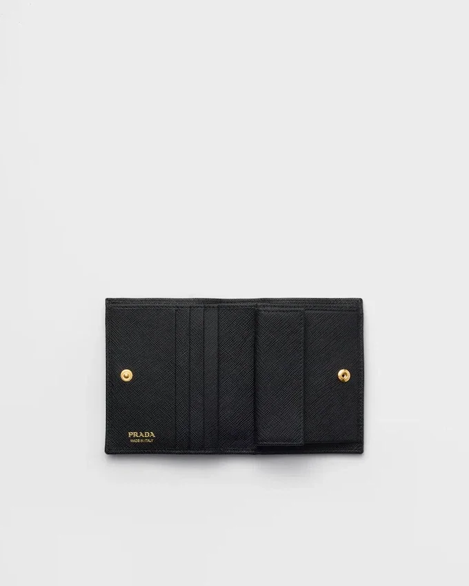 上質なSaffianoレザーを使用したこのモノクロの財布は、光沢のあるゴールドトーンのレタリングロゴがアクセントとなった、エレガントでミニマルなデザインです。内部には複数のコンパートメントとポケットが備わっています。