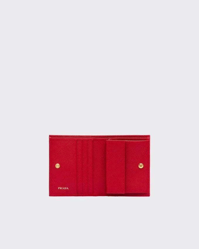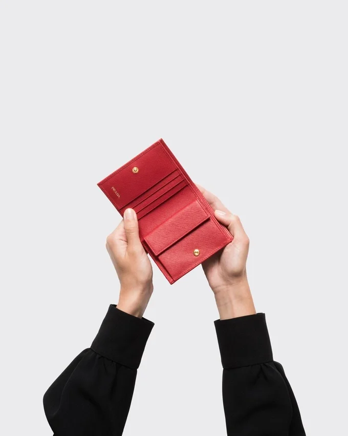 上質なSaffianoレザーを使用したこのモノクロの財布は、光沢のあるゴールドトーンのレタリングロゴがアクセントとなった、エレガントでミニマルなデザインです。内部には複数のコンパートメントとポケットが備わっています。