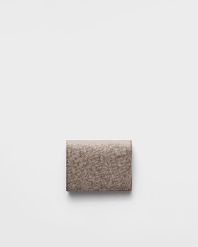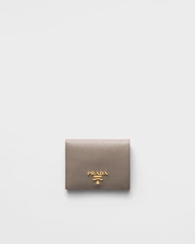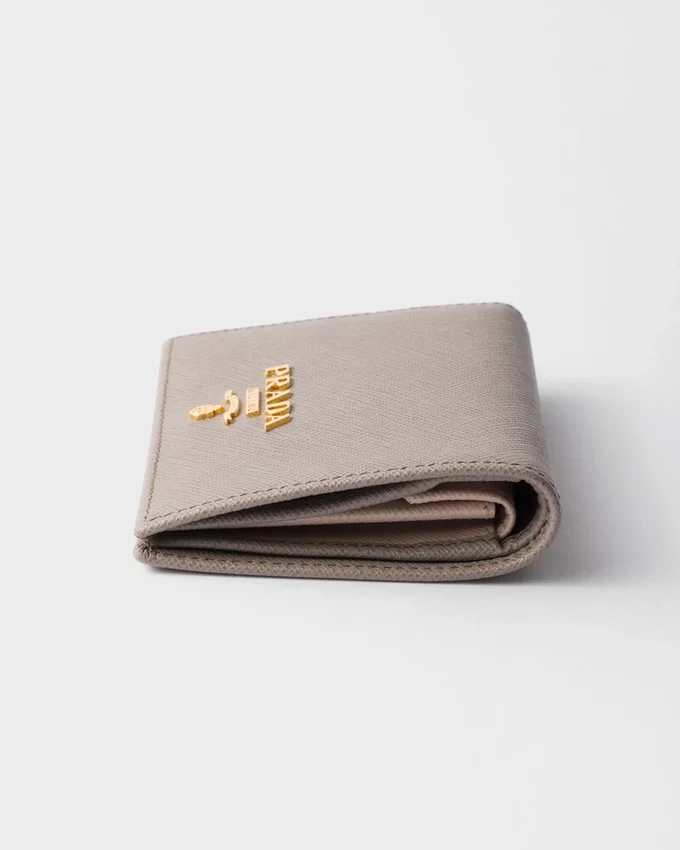ゴールドトーンのPradaロゴが施されたSaffianoレザー製の二つ折り財布。スナップ留めを開けると、カラフルなデザインで装飾されたカードスロット、紙幣入れ、小銭入れが現れます。