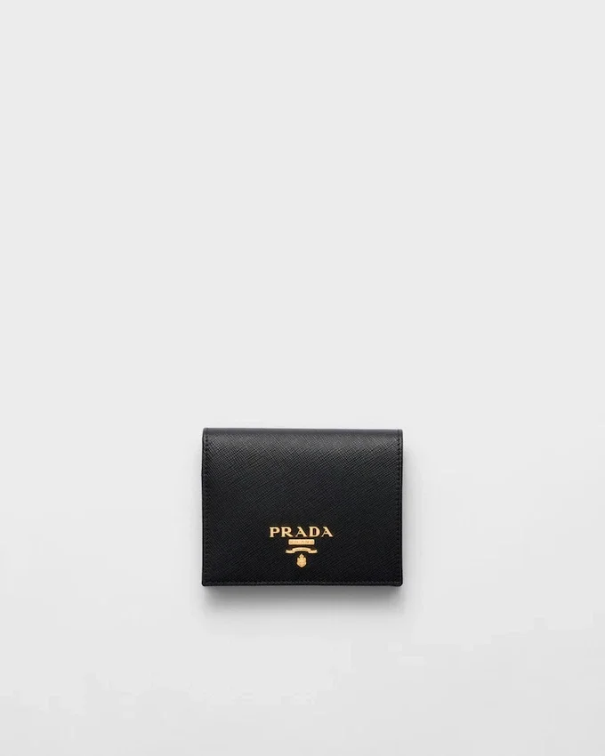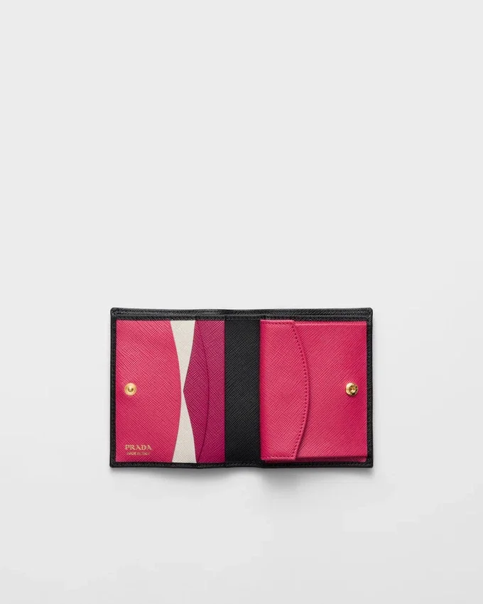 ゴールドトーンのPradaロゴが施されたSaffianoレザー製二つ折り財布。スナップ留めを開けると、カラフルなデザインで装飾されたカードスロット、紙幣入れ、コイン入れが現れます。
