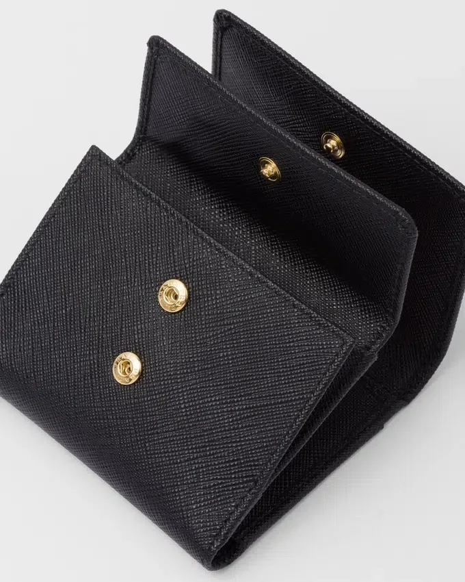 Saffianoレザー製のこの小型財布には、複数の内ポケットとカードスロットが備わっています。スナップ留め付きのこのアクセサリーには、メタルレタリングのロゴがあしらわれています。
