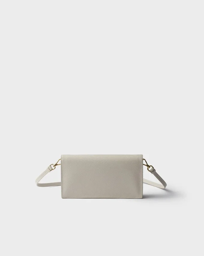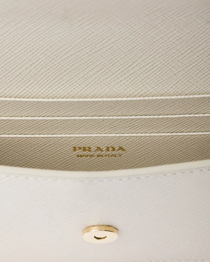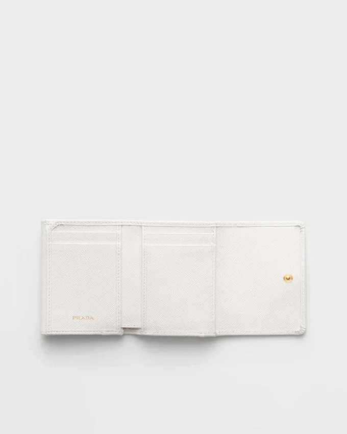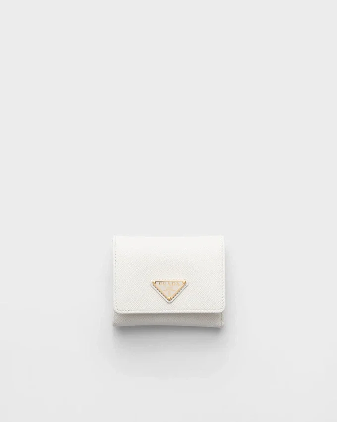 Saffianoレザー製のこの小型ウォレットには、複数の内ポケットとカードスロットが備わっています。スナップ留め付きのこのアクセサリーには、メタルレタリングのロゴがあしらわれています。