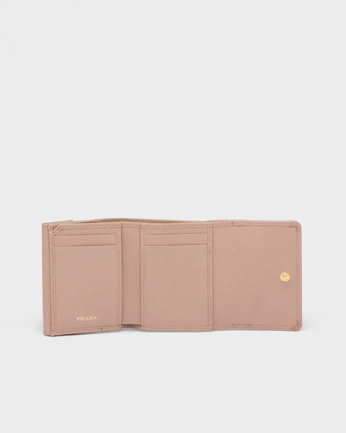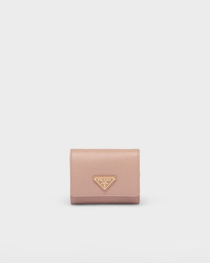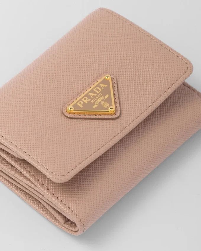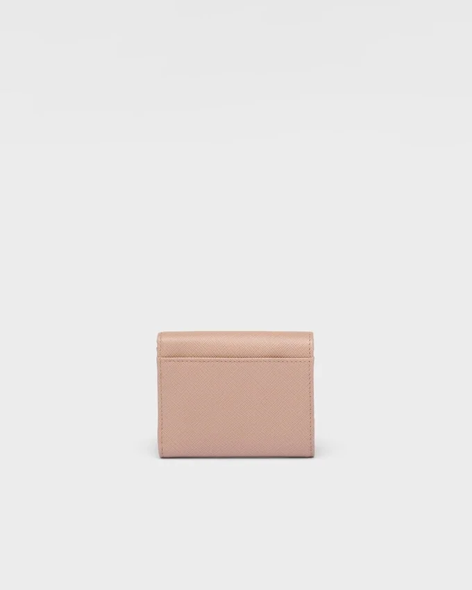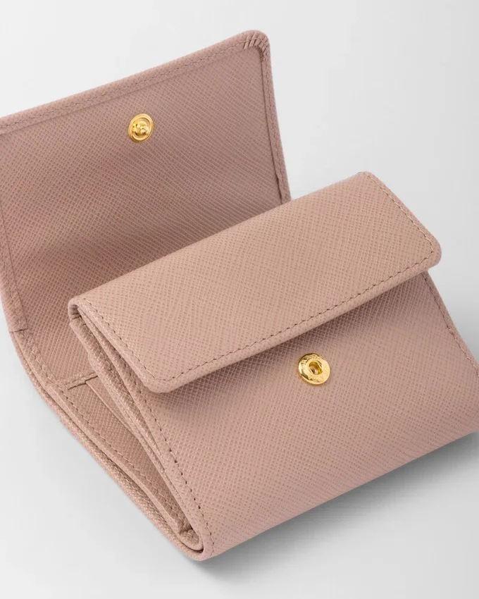 Saffianoレザー製のこの小型ウォレットには、複数の内ポケットとカードスロットが備わっています。スナップ留め付きのこのアクセサリーには、メタルレタリングのロゴがあしらわれています。