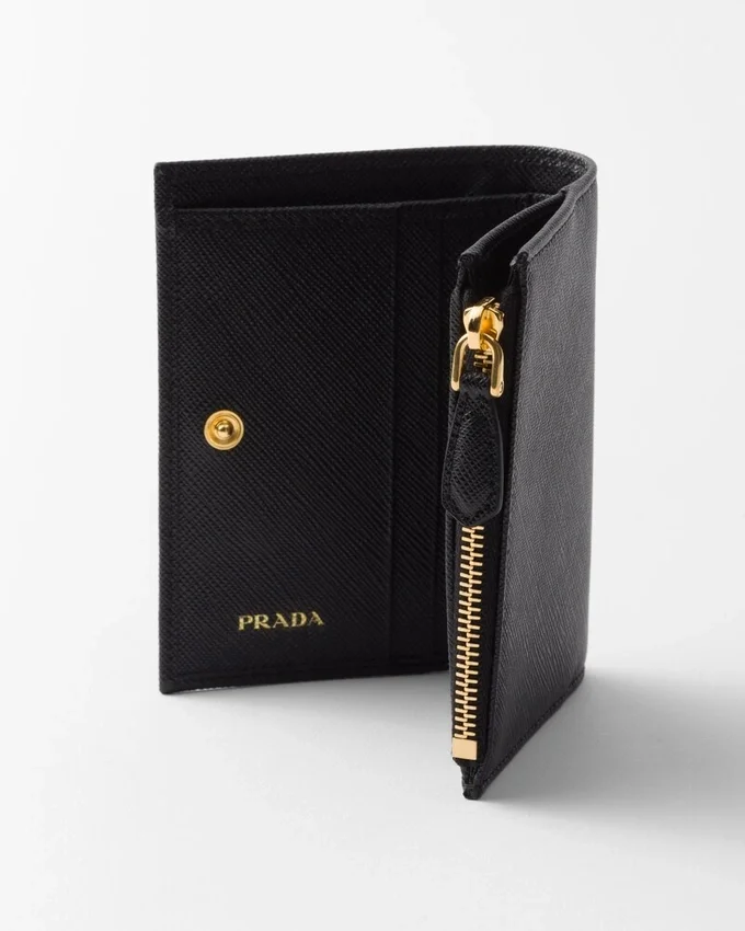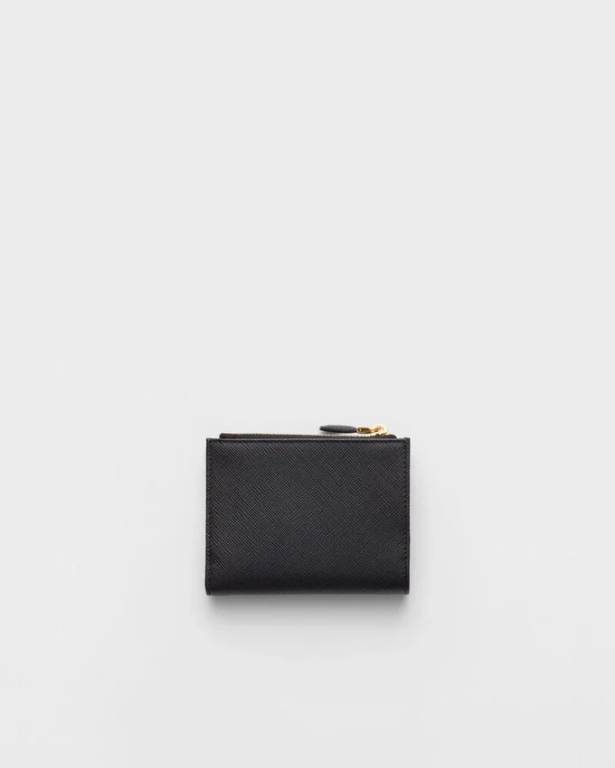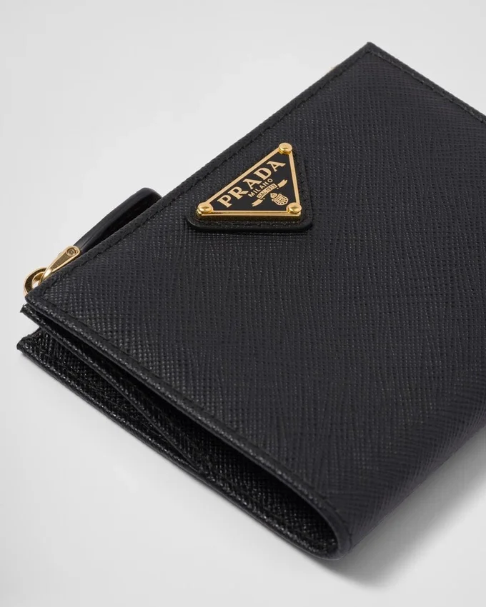 エナメル加工された金属製の三角ロゴをあしらったこのSaffianoレザーの財布は、洗練されたエレガントなデザインです。すっきりとしたラインが特徴のこのアクセサリーには、ファスナー付き小銭入れ、紙幣入れ、カードスロットが備わっています。<!–