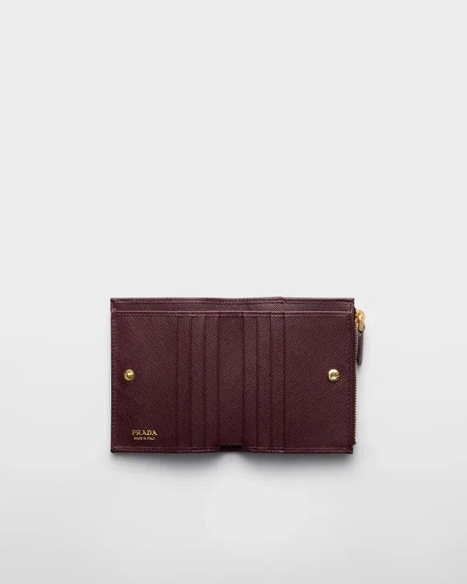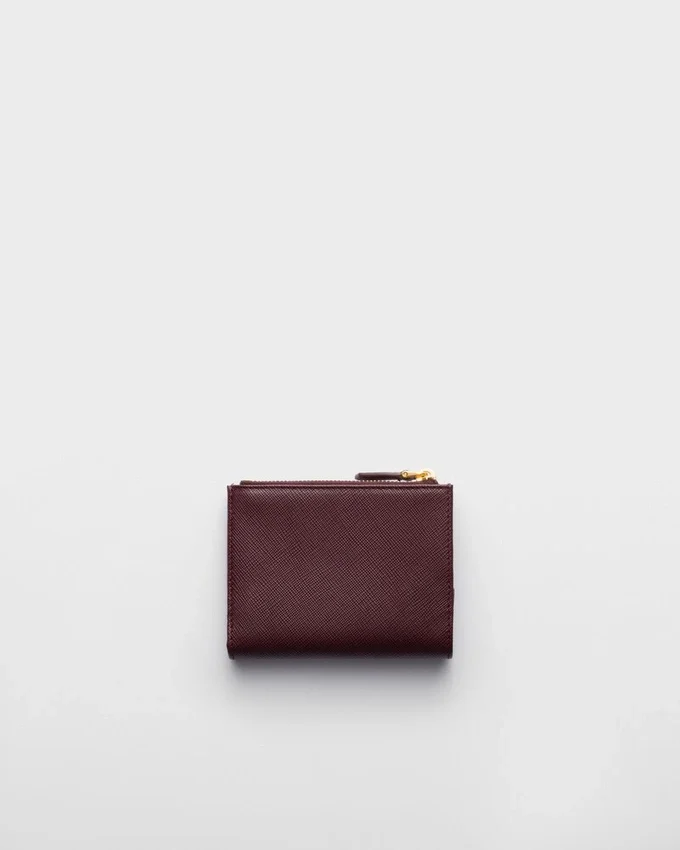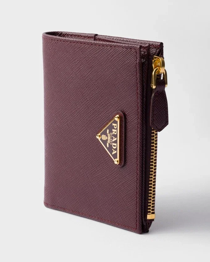 エナメル加工された金属製の三角ロゴをあしらったこのSaffianoレザーの財布は、洗練されたエレガントなデザインです。すっきりとしたラインが特徴のこのアクセサリーには、ファスナー付き小銭入れ、紙幣入れ、カードスロットが備わっています。<!–商品コード: 1Ml050_Qhh_F0007