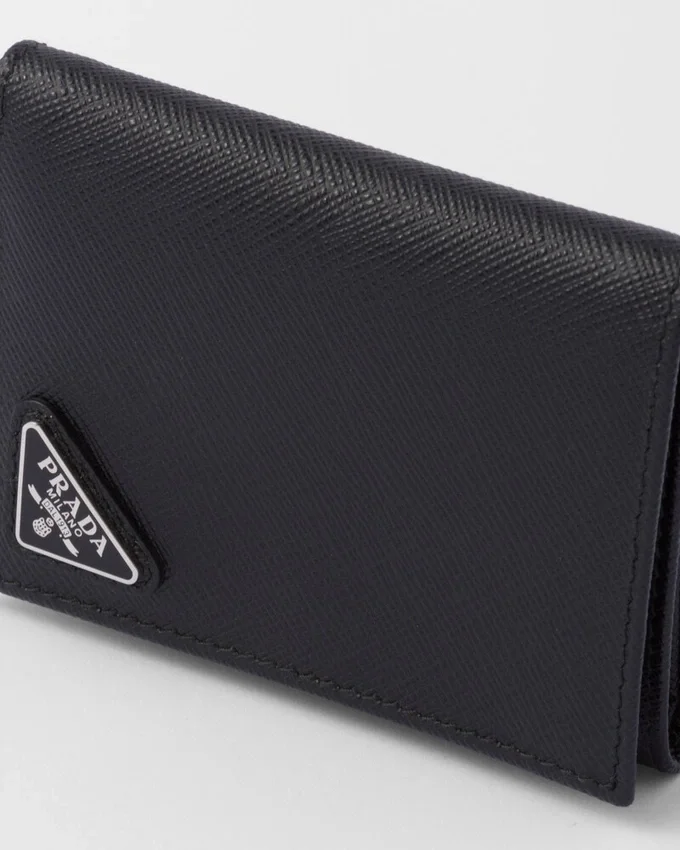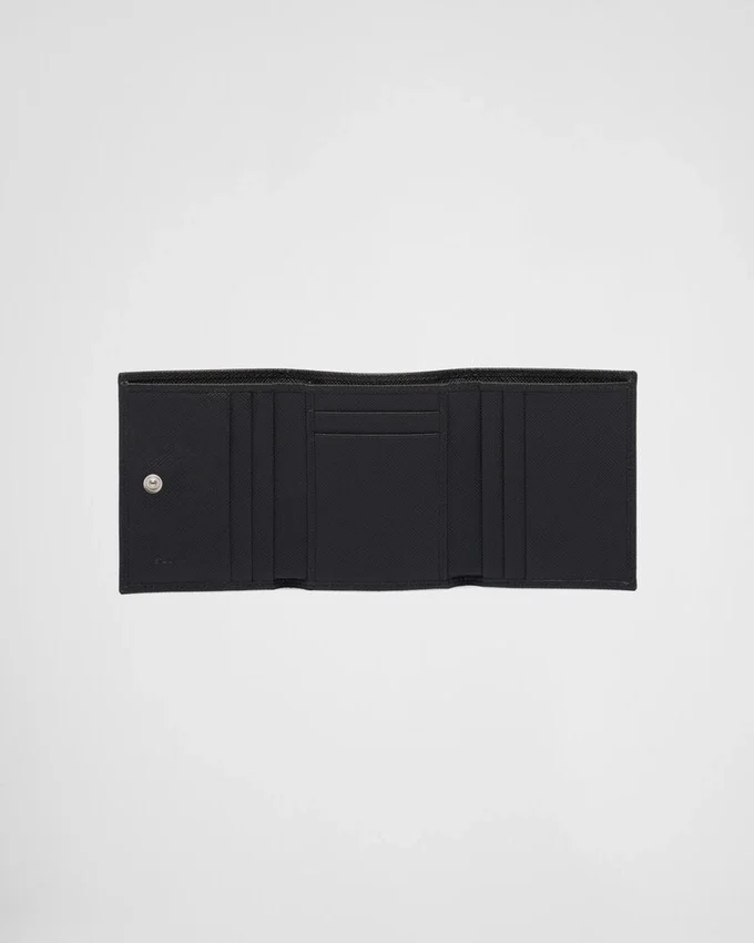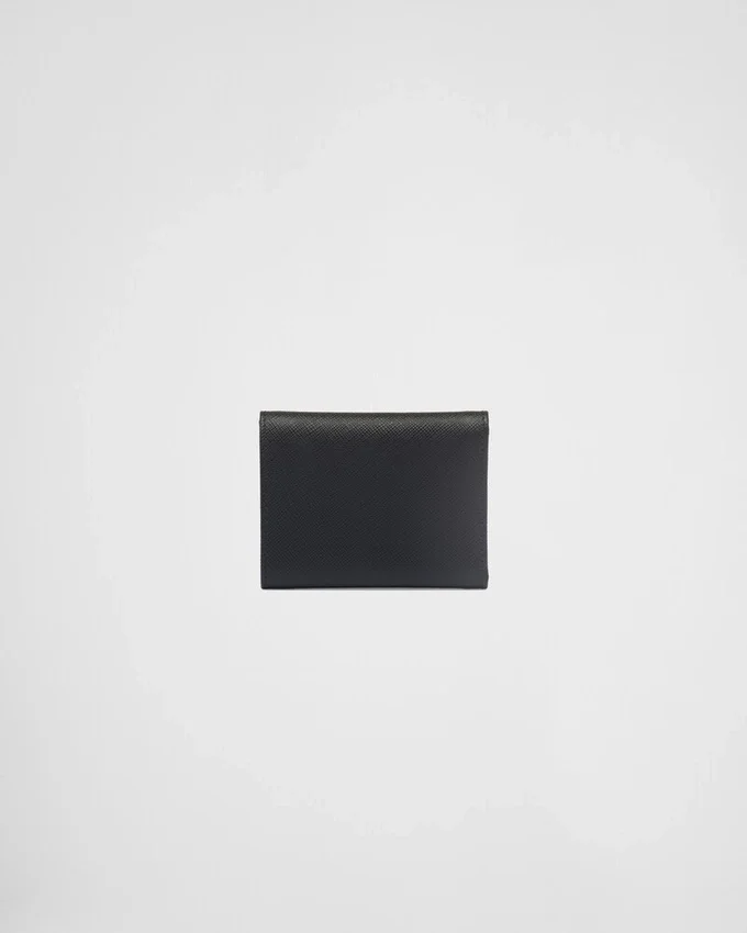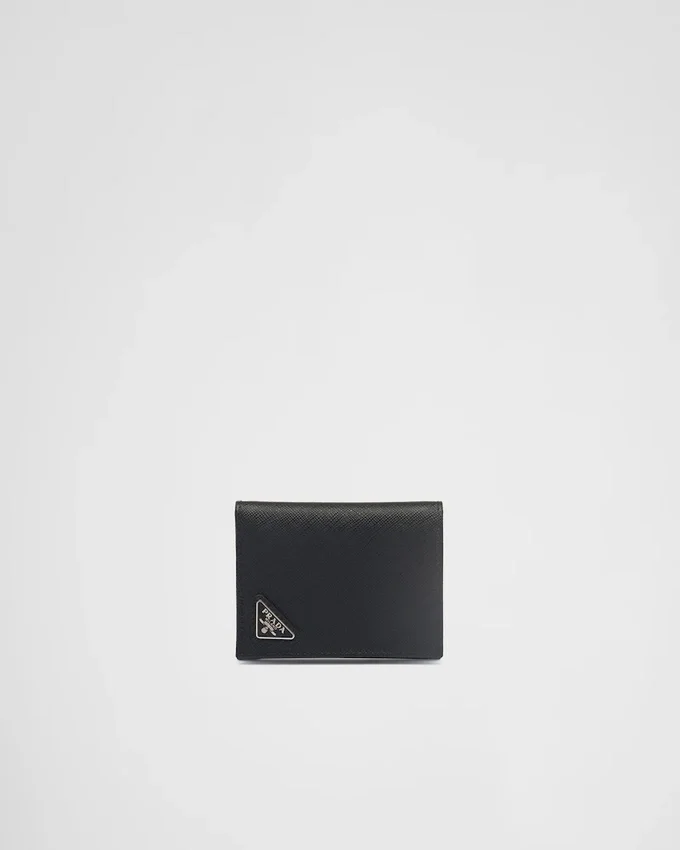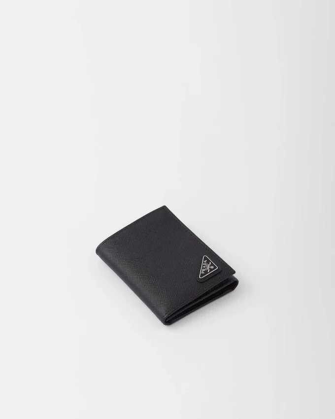 洗練されたラインとSaffianoレザーの象徴的な質感が特徴のこの財布は、前面にトライアングルロゴがあしらわれています。内部にはポケットや仕切りが備わっています。