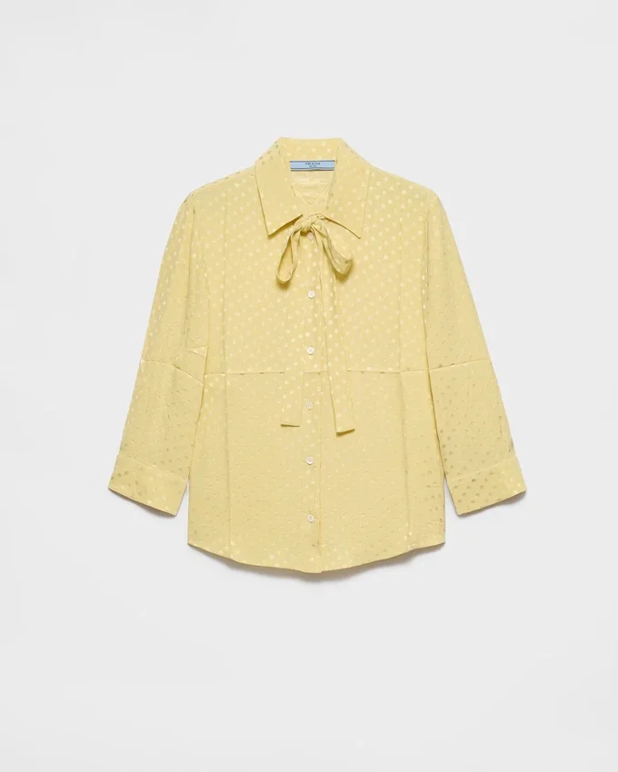 ロマンチックな魅力あふれるこの洗練されたシャツは、サテン素材を使用し、繊細で軽やかなシルエットを演出します。同系色のポルカドット柄と、プッシーキャットボウをあしらった襟がデザインを彩り、上品でフェミニンなアクセントを加えています。