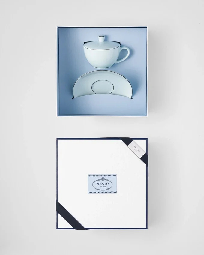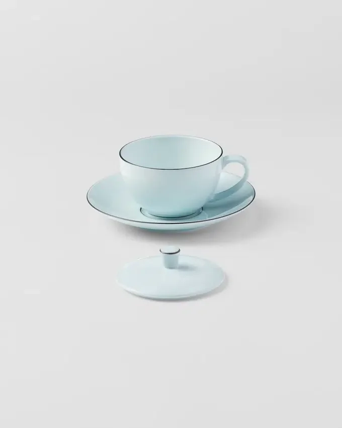 日本の古来の青磁陶器からインスピレーションを得たこのティーカップは、職人の技とPradaの美学が融合した洗練されたデザインです。極上の釉薬を施した磁器で作られたこのアイテムは、アイコニックで繊細な色合いを特徴とし、手描きで施された縁の装飾がさらにその魅力を引き立てています。