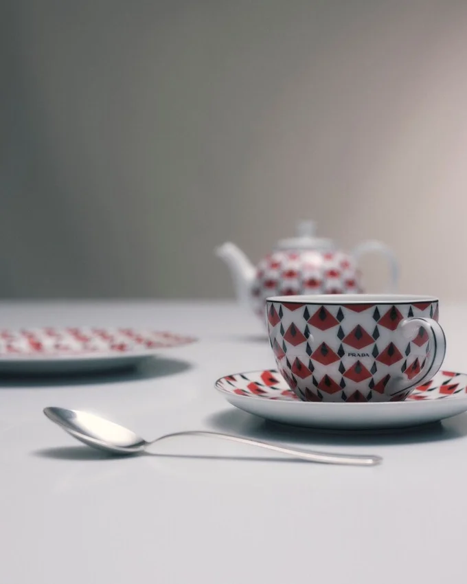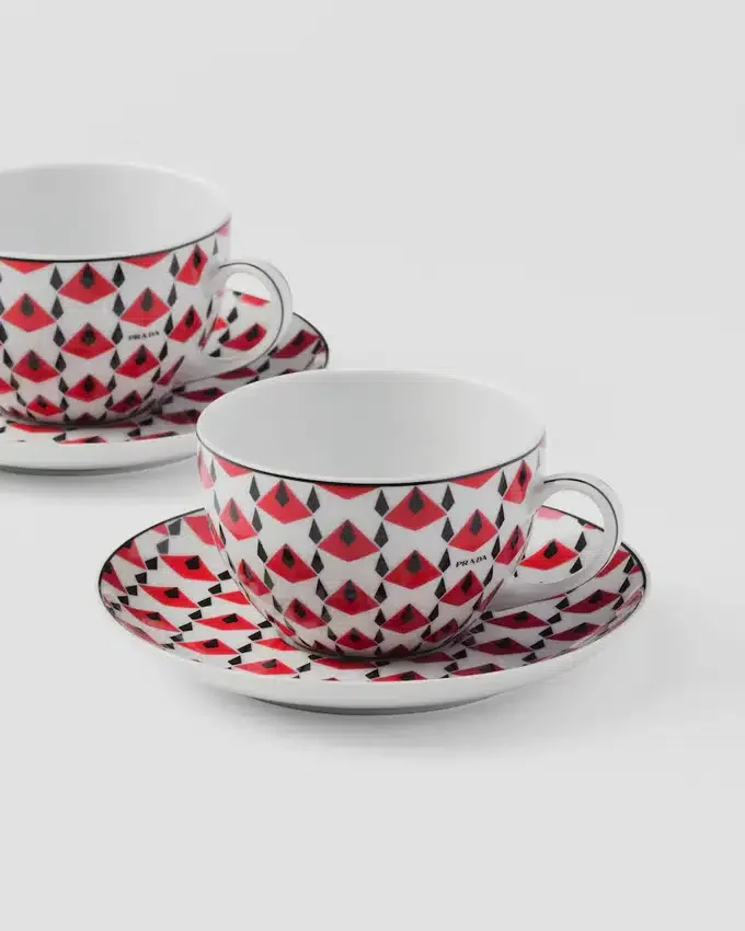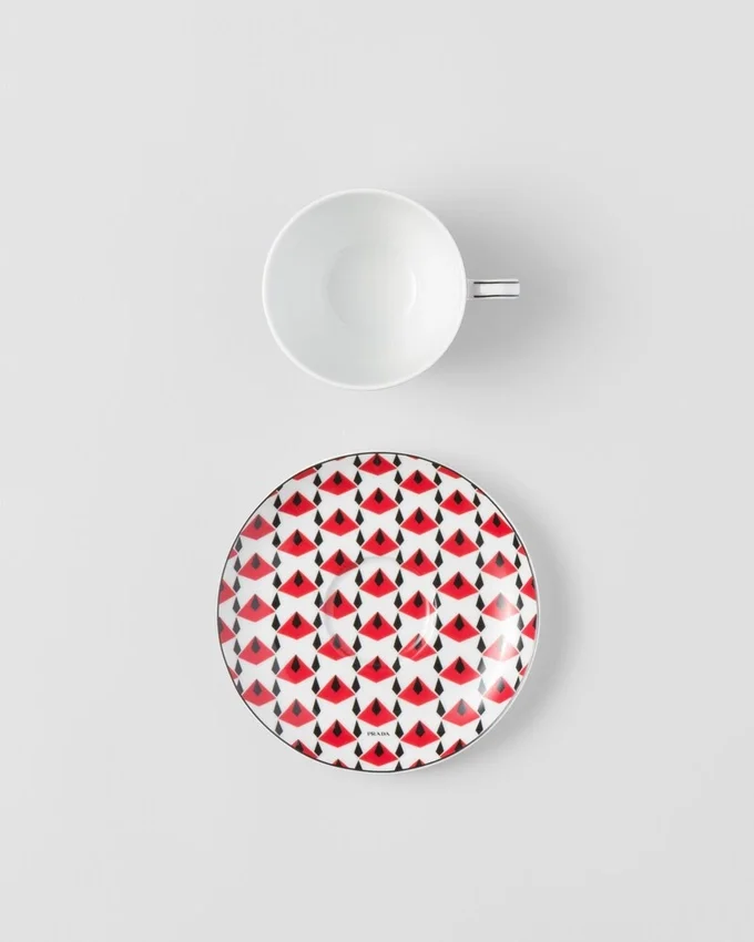 ソーサーとセットになったこのティーカップの洗練されたデザインは、1903年にウィーンの著名な建築家ヨーゼフ・ホフマンが創作したグラフィックモチーフから着想を得た、モダニズム的な幾何学模様で装飾されています。