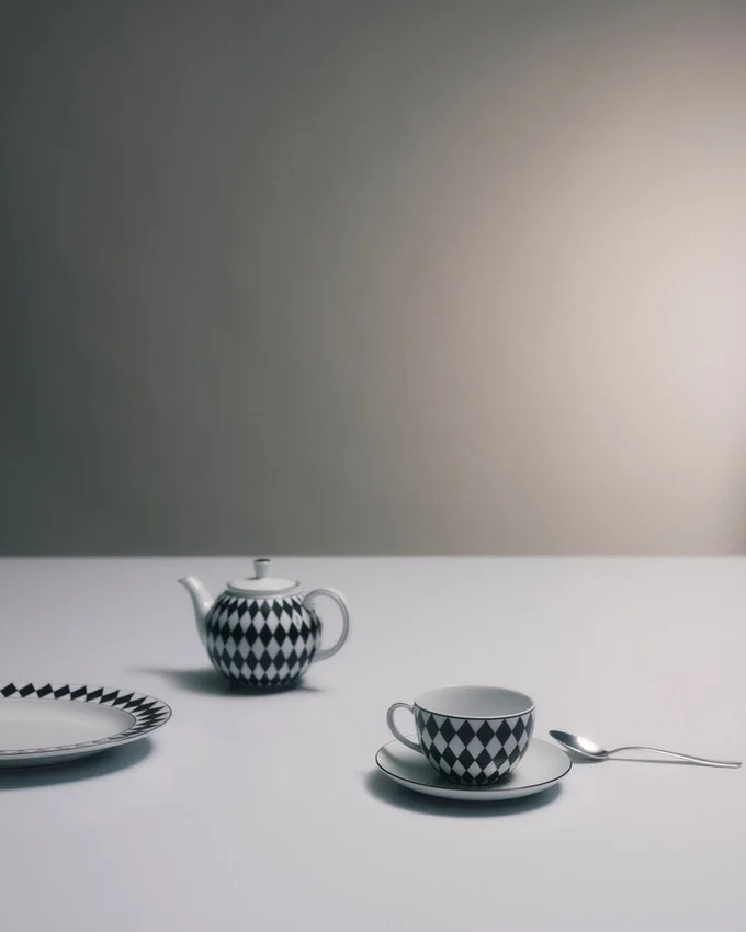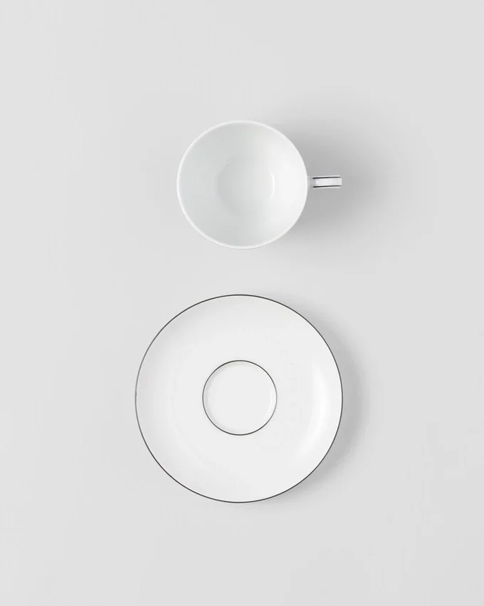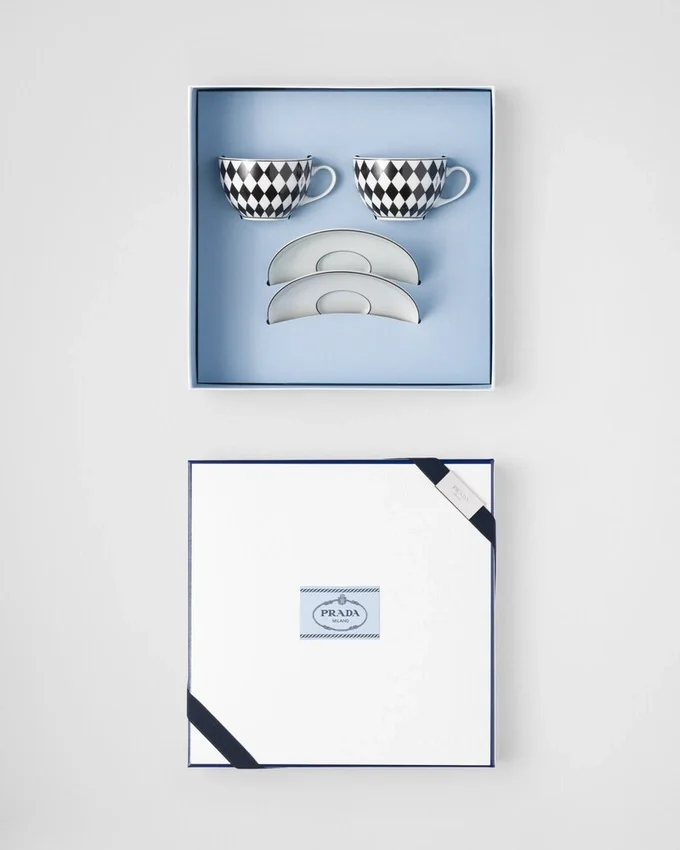 ミラノのヴィットーリオ・エマヌエーレ2世GalleriaにあるPradaの歴史ある店舗の白黒大理石の床からインスピレーションを得た、象徴的なチェッカーボード柄が、お揃いのソーサーを備えたこれらのエレガントなティーカップのデザインを彩ります。