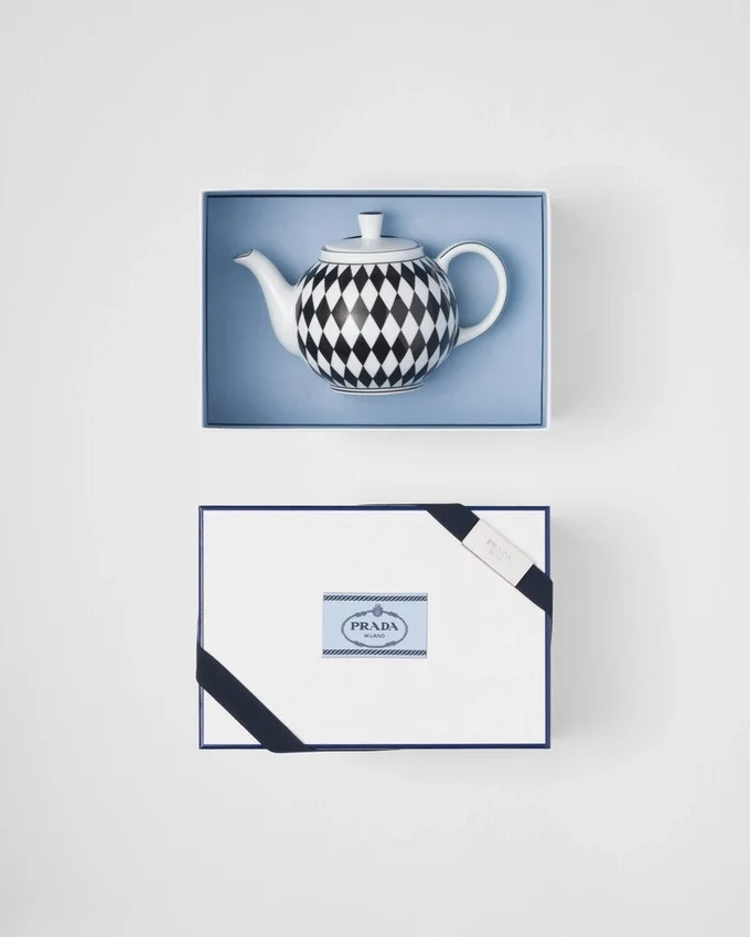 ミラノのヴィットーリオ・エマヌエーレ2世GalleriaにあるPradaの歴史ある店舗の白黒大理石の床から着想を得た、象徴的なチェッカーボード柄が、極上の磁器で作られたこのティーポットを彩っています。