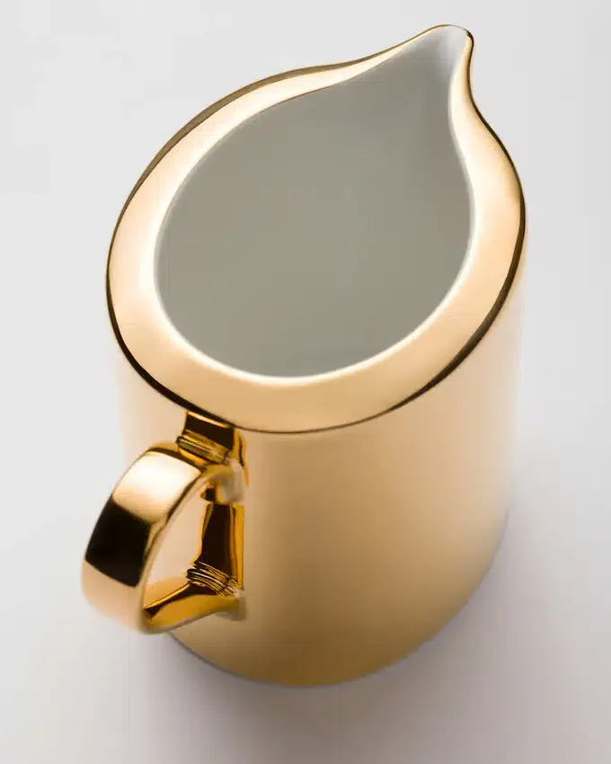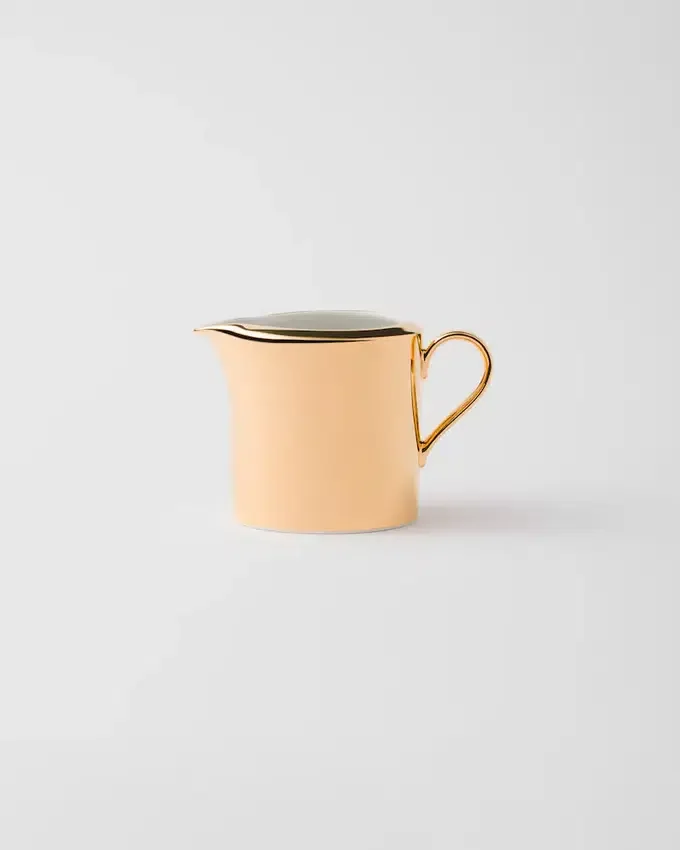 最高級の日本製磁器で作られたこのミルクジャグは、伝統と職人技をPradaの革新的な美学と融合させています。純金による手作業の装飾が施されており、デザインのモダンなラインを引き立てる貴重なディテールとなっています。洗練された雰囲気を食卓に添えるのに最適です。