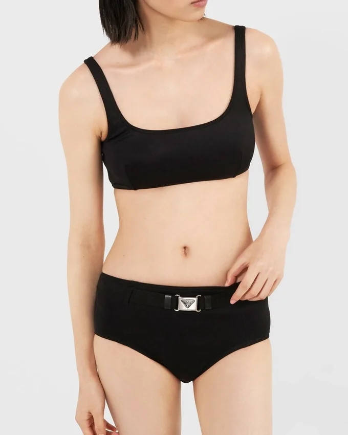 この編み込みナッパレザーブレスレットは、象徴的なエナメル加工の金属製トライアングルロゴを彷彿とさせる、幾何学的な金属製のTバー留め具が特徴です。