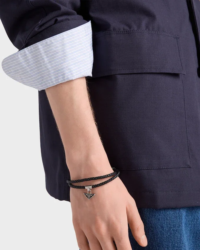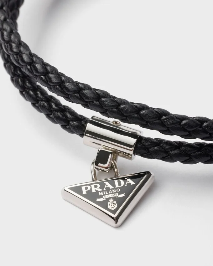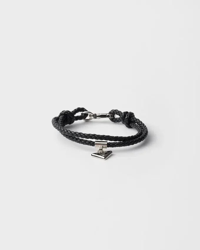 この編み込みレザーブレスレットは、三角ロゴをあしらったモダンな留め具が特徴です。