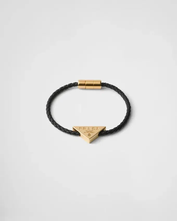 洗練された編み込みモチーフが、メタル製のバレル型スクリュー留め具を備えたこのナッパレザーブレスレットに活気を添えています。 メタル製のトライアングルロゴチャームが際立っています。
