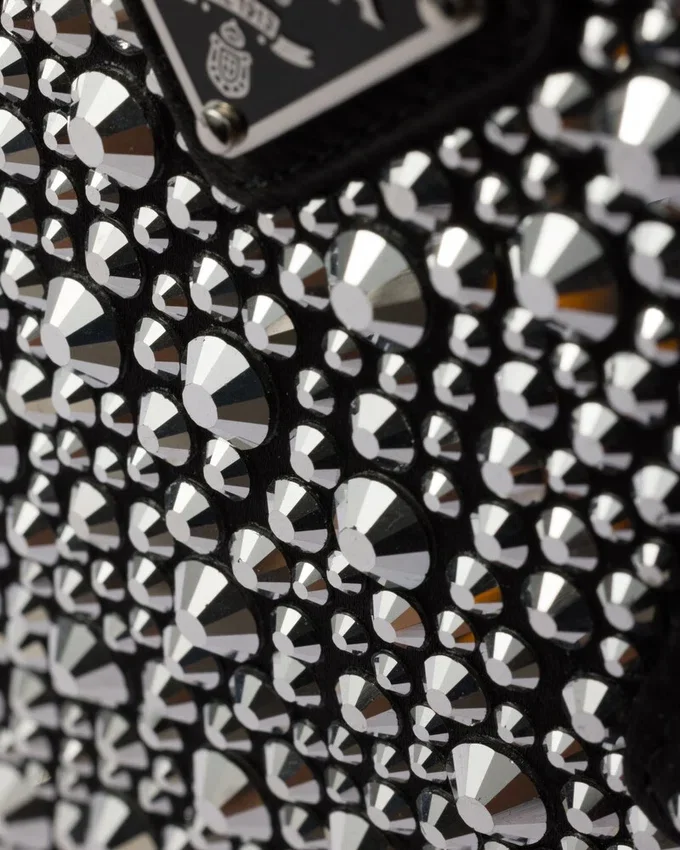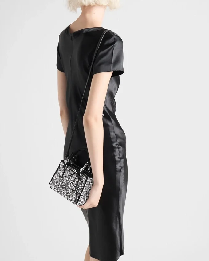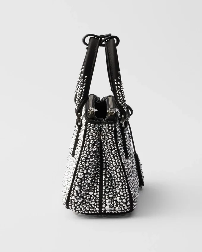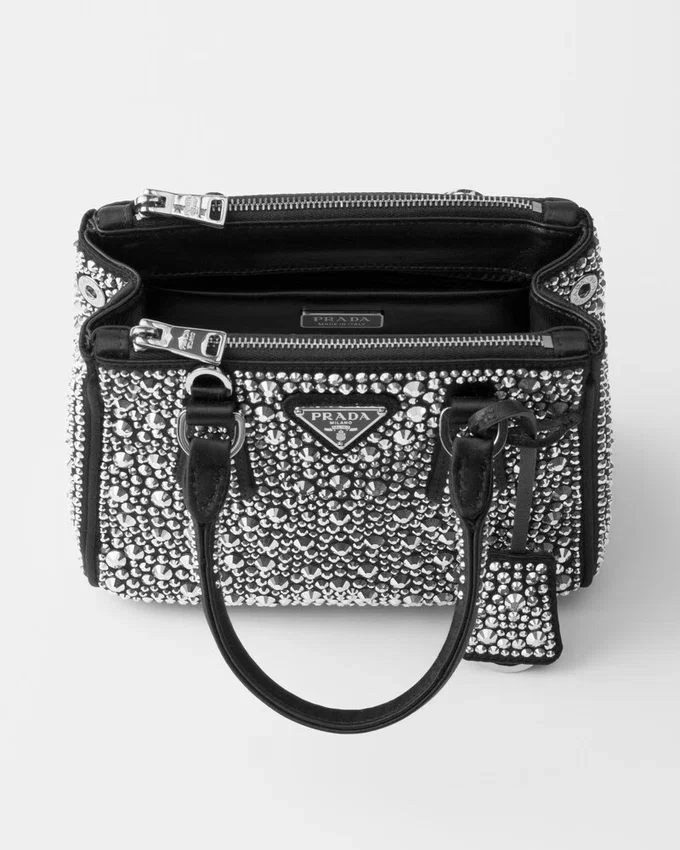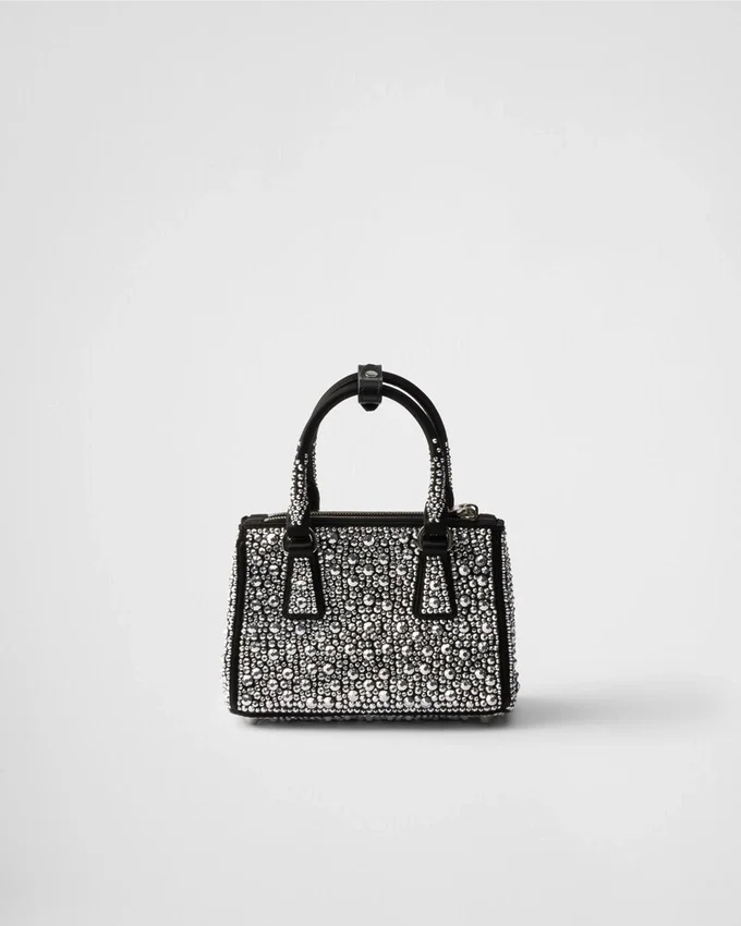 Pradaの象徴的なGalleriaは、時代を超えたデザインを通じて、ブランドの洗練されたエレガンスと卓越した職人技を体現しています。マイクロサイズで登場したこのモデルは、サテン地を使用し、大小さまざまなきらめくクリスタルをあしらい、きらめきときらめきの絶妙なコントラストを生み出しています。