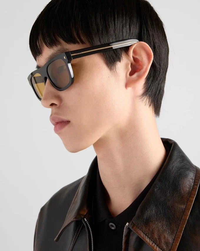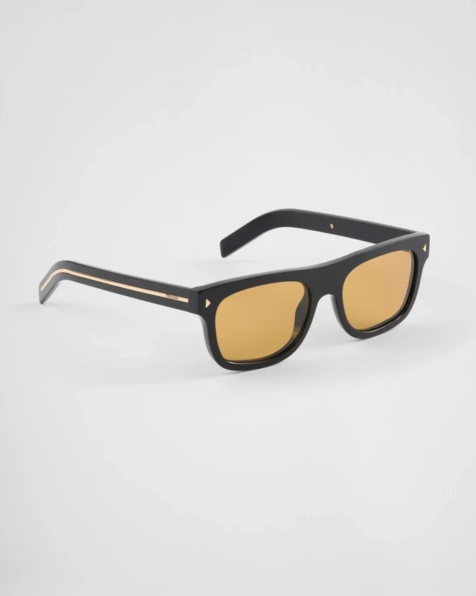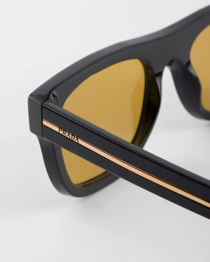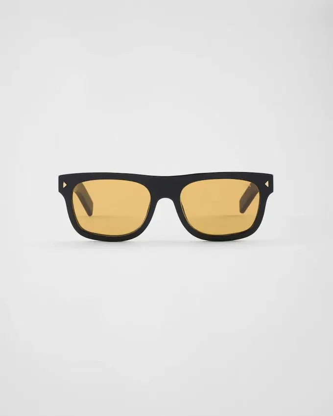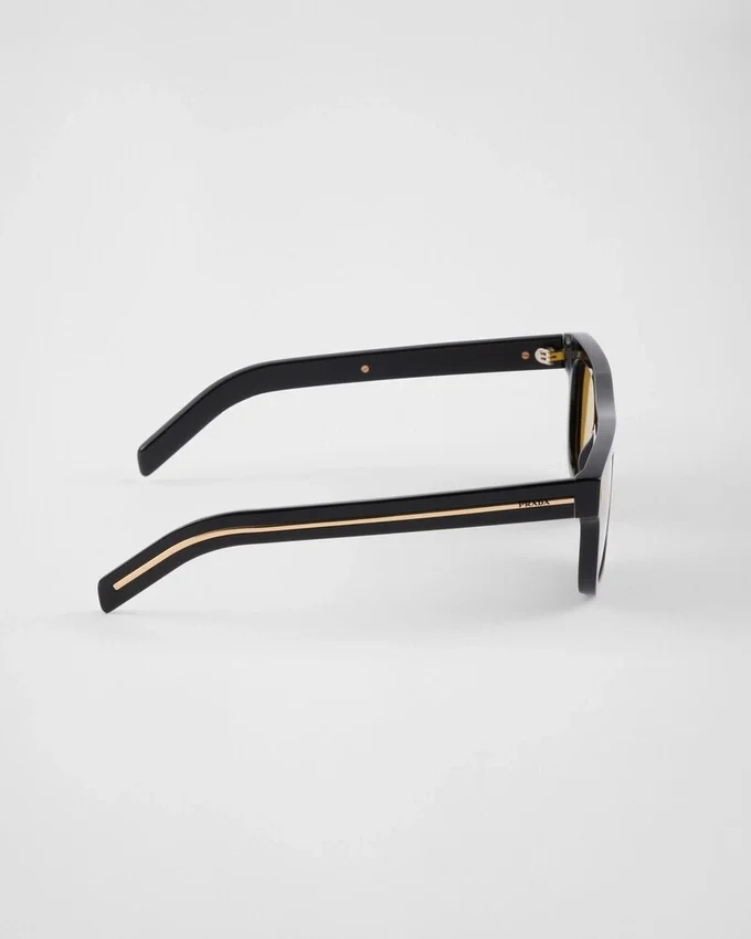 現代的で幾何学的なデザインのアセテート製サングラス。フラットなスクエア型のフロントは三角形のメタルリベットで際立ち、テンプルにはPradaのレタリングロゴをあしらった象徴的なメタルパーツが装飾されています。