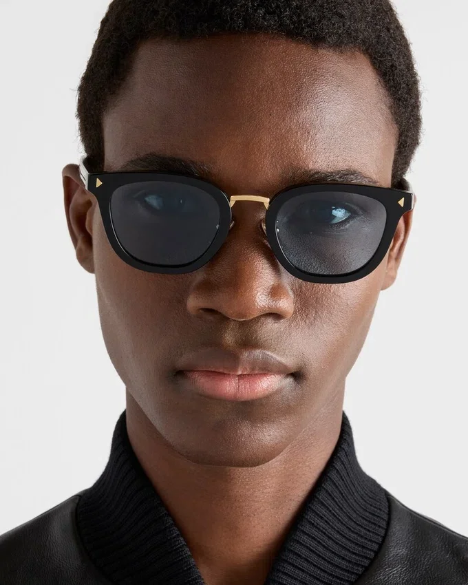 洗練されたレトロな魅力を持つ、パントスデザインのアセテート製サングラス。フレームは、フロント部分のメタルブリッジとリベットによる洗練されたタッチが特徴で、ストレートテンプルには、PRADAのレタリングロゴをあしらった象徴的なメタルプレートが装飾されています。