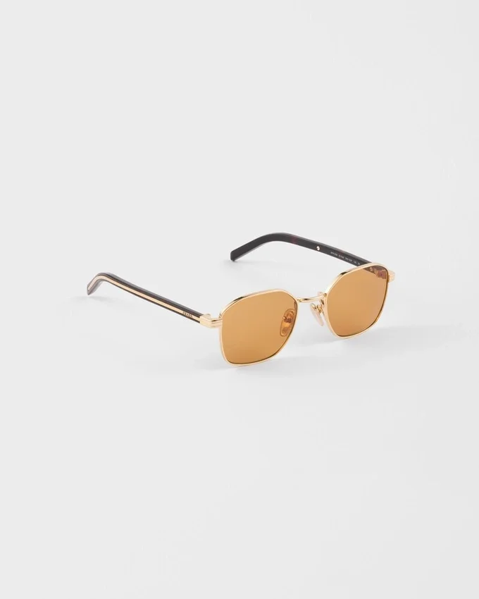 カジュアルな雰囲気のメタルサングラス。長方形のフレームに六角形のレンズ、そしてPradaのレタリングロゴをあしらった象徴的なメタルプレートで装飾された細身のテンプルが特徴です。